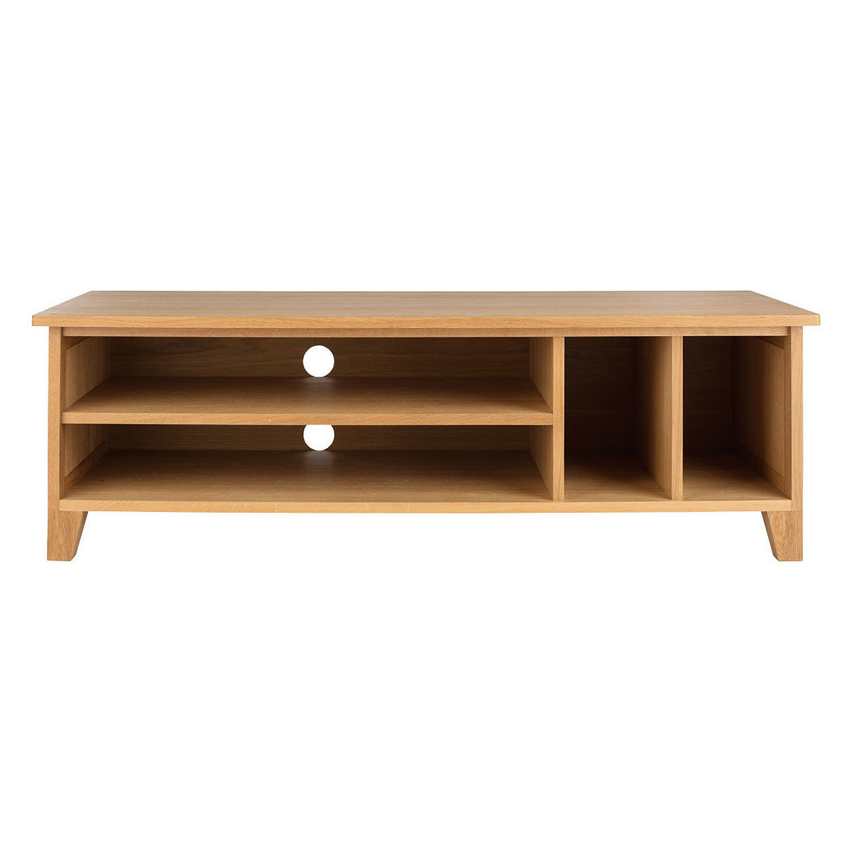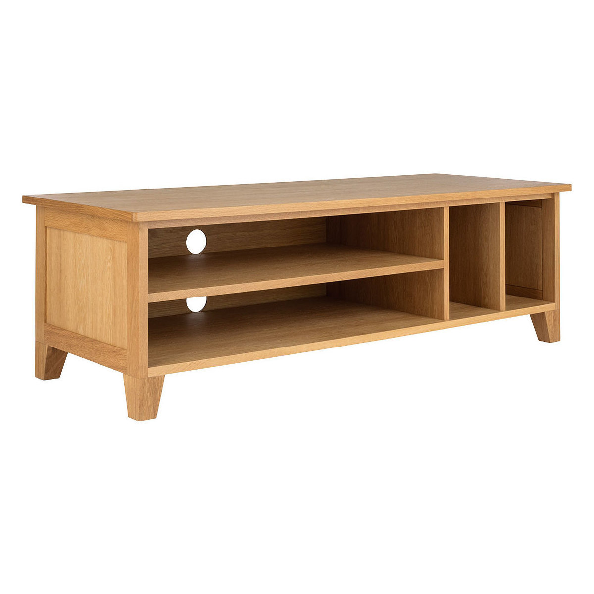 The large Anderson solid oak TV stand is a handsome design with rounded edges and clean, simple lines in wood that displays a beautiful wild grain. Designed in house, the sturdy open stand has 2 shelves and 2 storage compartments for equipment and accessories. Suitable for TVs up to 25kg, the stand is part of the Anderson range, which includes a matching bookcase and coffee table, and a dining table and bench with painted bases.