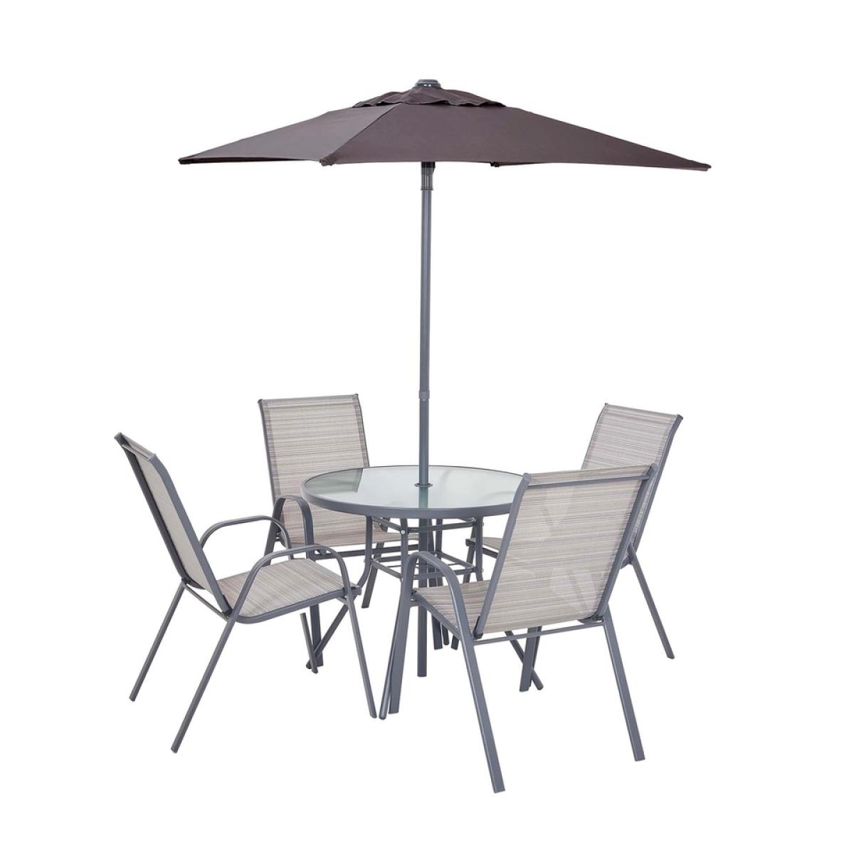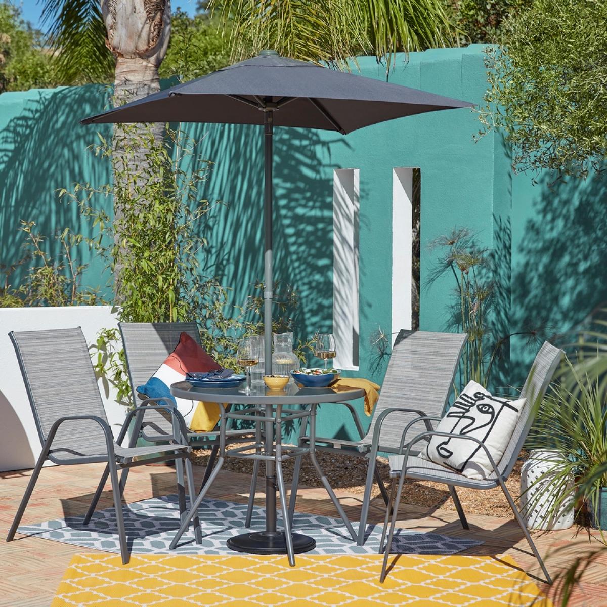 Whether al fresco dining, sharing a drink or hosting garden parties, this six piece garden dining set is perfect for all of your special occasions. The stylish and modern design of this garden furniture set includes four comfortable and inviting chairs made with a weather resistant textilene fabric so that your family and friends can truly relax and enjoy themselves, whilst the included dark grey parasol offers plenty of shade as it protects from harsh rays and other elements. With a beautiful glass top table this stunning outdoor dining set will create a spectacular focal point of your garden.