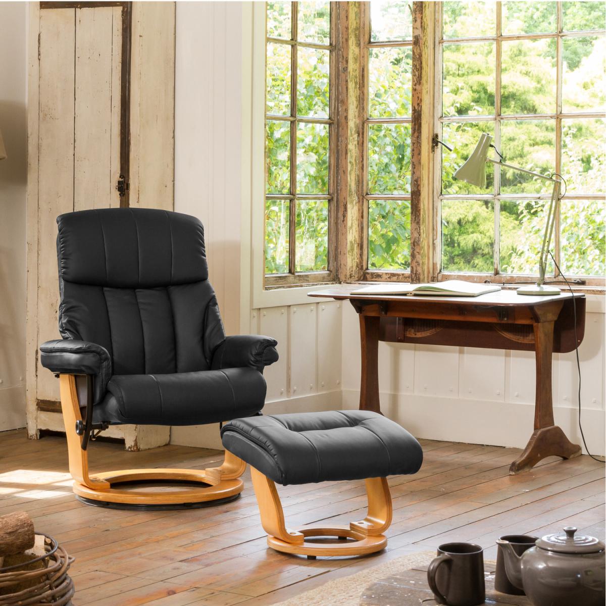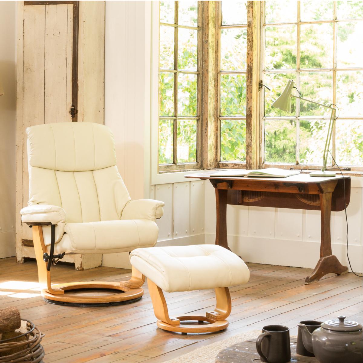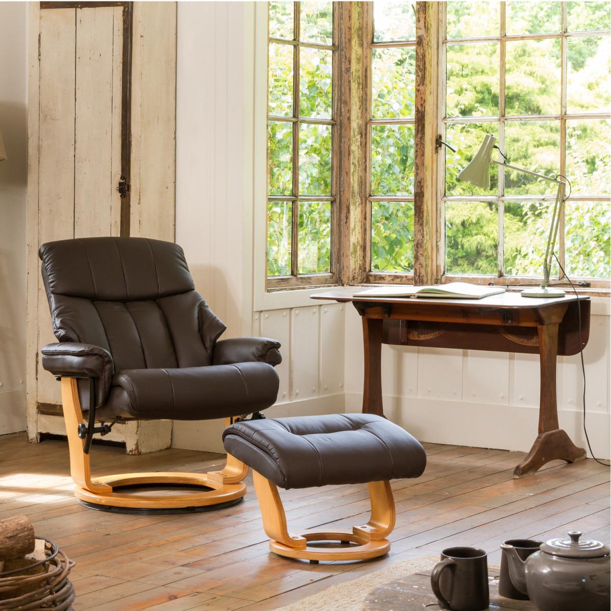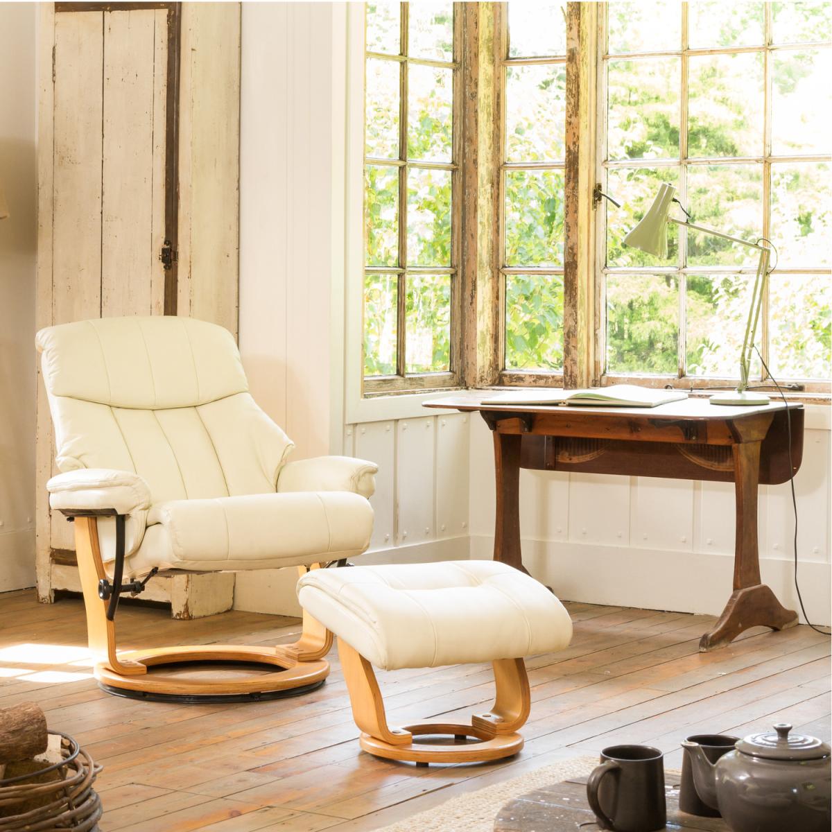 The Andover Swivel Recliner has been an established part of our range for a number of years and a consistent best seller. The chair is constructed from solid, hardwood with a pine coloured finish. The seat, back and arms are foam filled for comfort and covered with durable bonded leather with a faux leather match used on the low-stress areas. The reclining mechanism is a piston action and operated with body movement and there's an easy to use handle under the chair to fix the chair in any position.