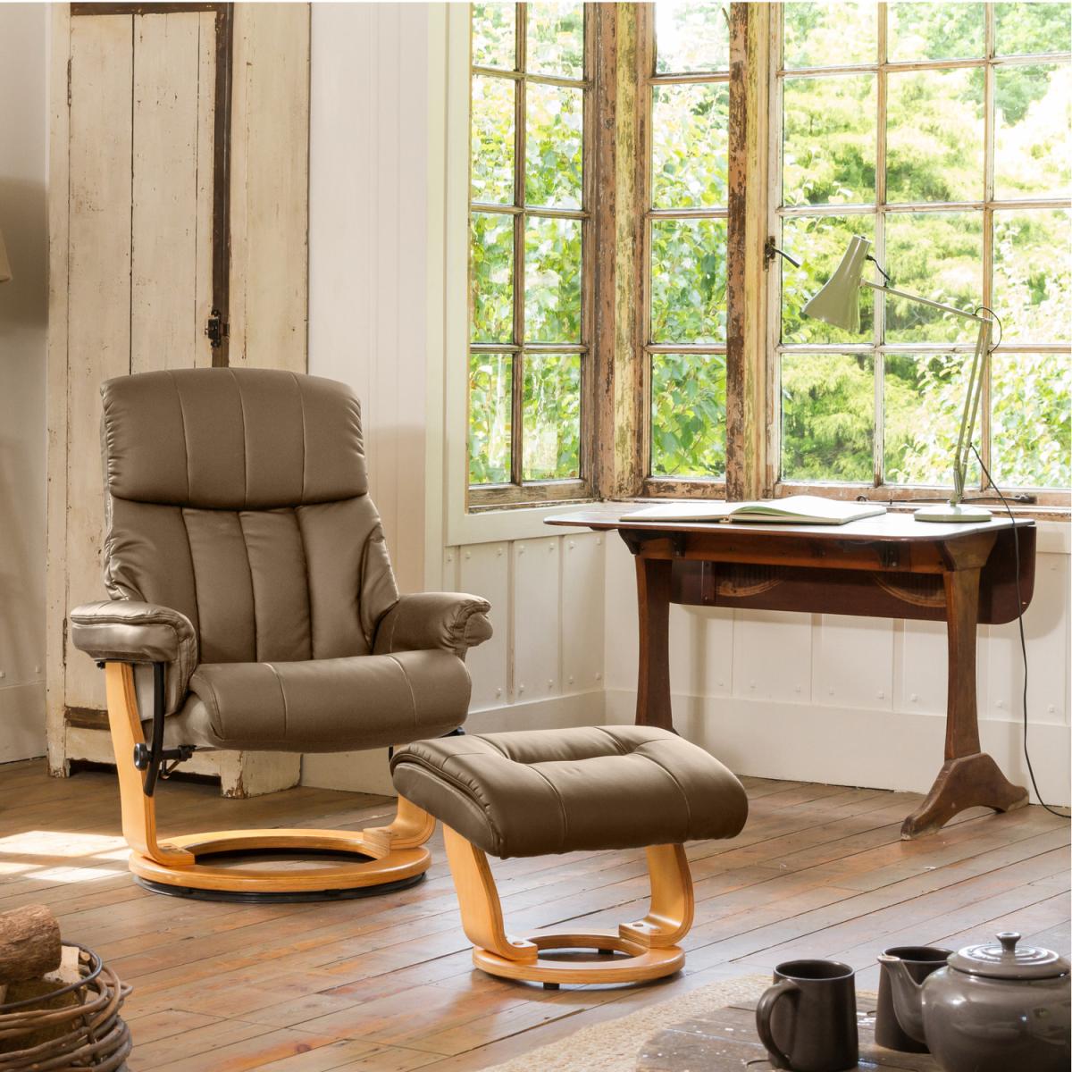 The Andover Swivel Recliner has been an established part of our range for a number of years and a consistent best seller. The chair is constructed from solid, hardwood with a pine coloured finish. The seat, back and arms are foam filled for comfort and covered with durable bonded leather with a faux leather match used on the low-stress areas. The reclining mechanism is a piston action and operated with body movement and there's an easy to use handle under the chair to fix the chair in any position. The chair also boasts integrated massage points in the seat, lower back and upper back with a heat function also present in the lumbar area.