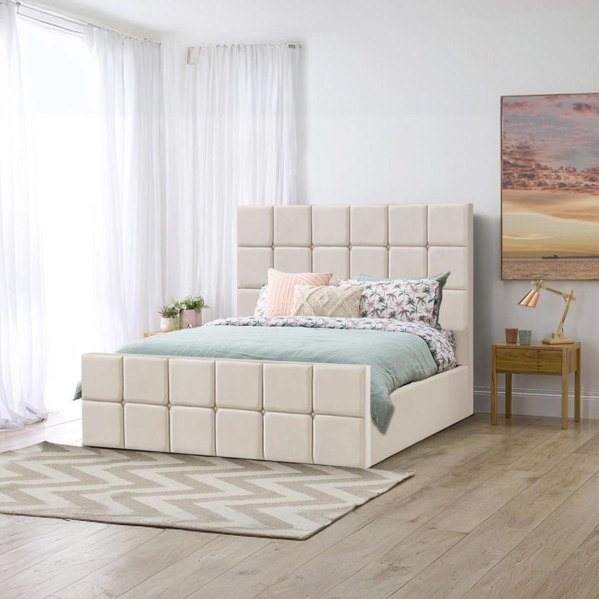 This cube design storage bed is created in regards to modern style and gives you a look of latest trends to decorate your bedroom. The patterns created on this bed are based on unique but exquisite longitudinal margins that creates a graceful appearance. Furthermore, these elegant patterns are craved out on finest quality of velvet that enhance the aesthetic aspect of this bed. In addition, this bed also features a sublime experience of softness and coziness to offer you with a sound sleep that you have yearned for decades. Succinctly, our beds are the kinds of bed that you dream to possess and experience a relaxing slumber to eradicate all the tired of the weary days. Headboard Height 125cm