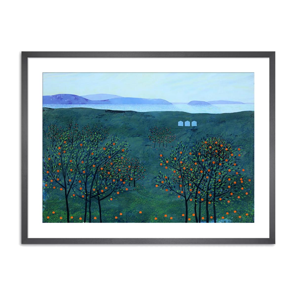 A surreal-like orange grove on blue, by artist Andrew Lansley. This museum-quality fine art print is made in the UK and glazed with a window mount in a solid ash wood frame, ready to wall mount by the fittings on the back. Painter and printmaker Andrew Lansley lives and works in Bath. His focus is on landscape, marine and architectural subjects, generated from direct experience and recorded through memory, drawing and photography. Using raw pigments and tempera mediums including egg, casein, varnish and watercolour, Andrew creates beautifully textural paintings. He has exhibited at the Royal Academy, Royal West Of England Academy, in the Lynn Painter-Stainers Prize and Sunday Times Watercolour Prize exhibitions. Have you thought about wall hooks and fittings?