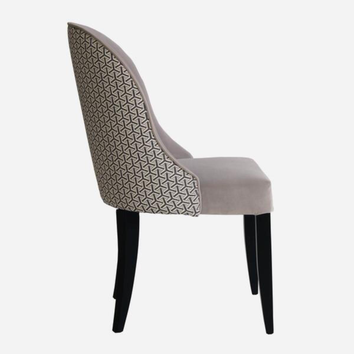 A comfortable dining chair with padded seat, full back rest and dark wood legs that are slightly tapered at the back. Aldwick has been upholstered in our smooth Villandry Dove fabric, with its stain and crease resistant properties and then complimented by our geometric Monte Storm weave on the reverse of the dinig chair. With a smooth, curved back, this simple and classic design is both elegant, versatile and very comfortable.