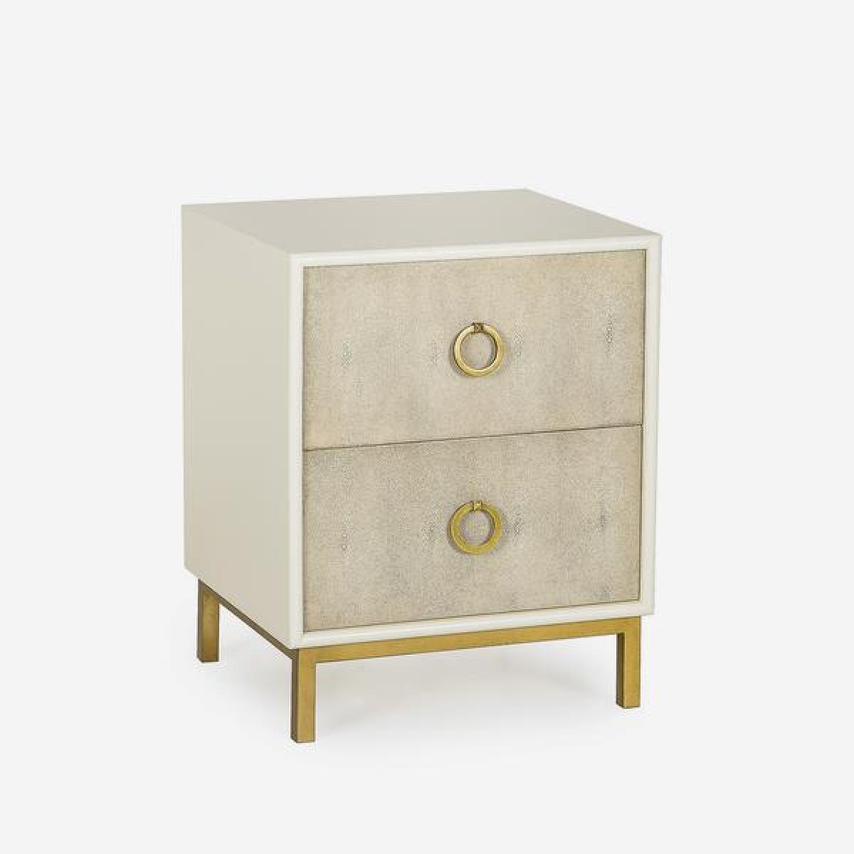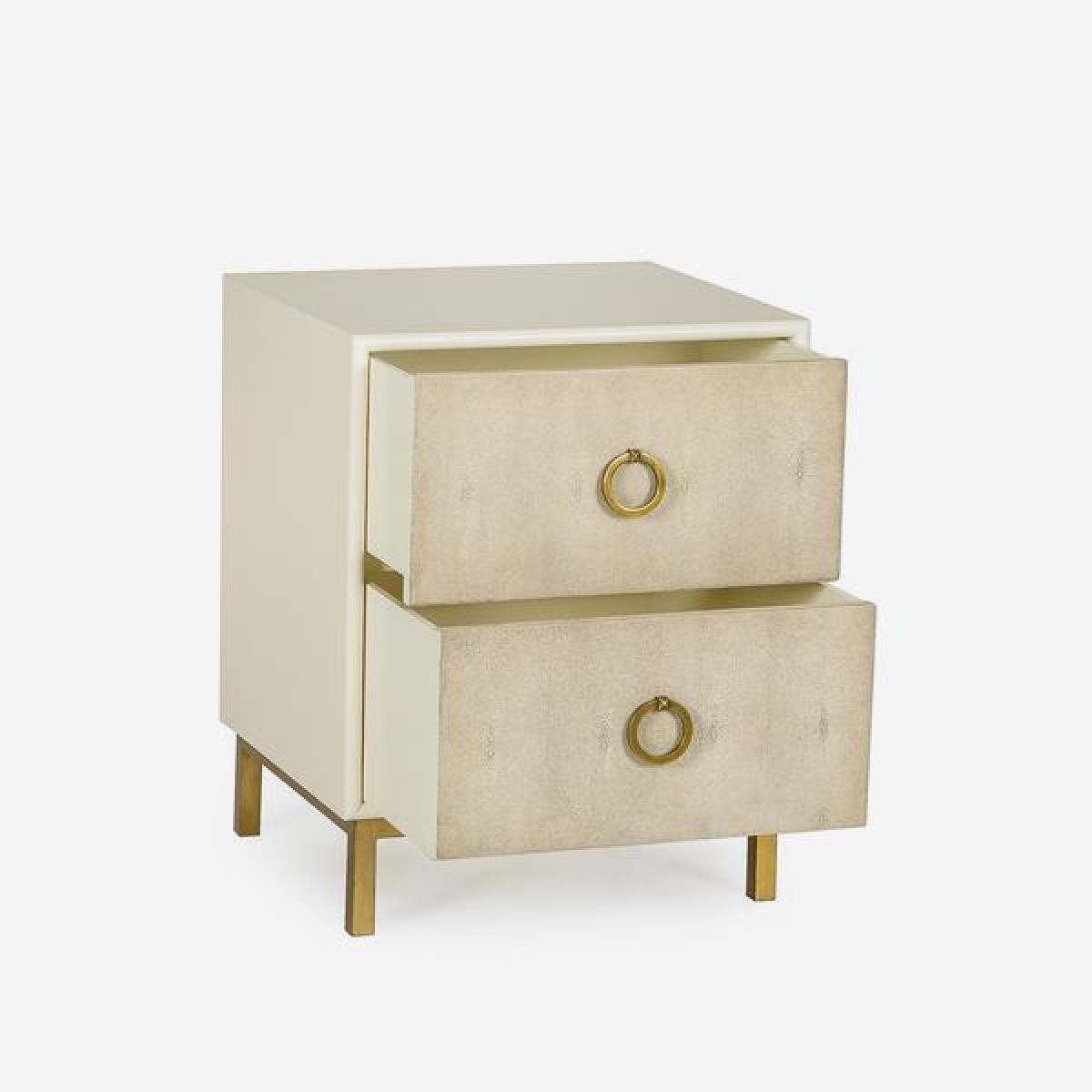 An elegant bedside table framed in cream lacquer that exquisitely compliments the neutral faux shagreen drawer fronts, accented with lustrous satin brass legs and handles. This piece will suit a contemporary luxe bedroom scheme. *Moot Trading Ltd is not a lender and acts only as an introducer. The credit product is provided by Klarna Bank AB (publ). Credit is only available to permanent UK residents aged 18 and over, subject to status. Terms and conditions apply. Please note that the following products are not regulated by the FCA: Pay in 30 days and Pay in 3 instalments. Read More.