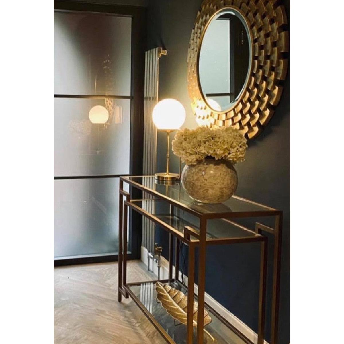 Capturing the design and style of the 1920s, this stunning Andrew Martin architect console table will add some stunning art deco style to your room with its burnished gold frame and tempered glass shelves. The geometric design perfectly reflects the 1920 decorative style and will add a beautiful feature to your room. Stylish and practical, the console table has three glass shelves and is a versatile piece that could be used as a display unit for your lamp, art, photos or vases or give it a more functional use as an open drinks cabinet or simply for newspapers and magazines. *Moot Trading Ltd is not a lender and acts only as an introducer. The credit product is provided by Klarna Bank AB (publ). Credit is only available to permanent UK residents aged 18 and over, subject to status. Terms and conditions apply. Please note that the following products are not regulated by the FCA: Pay in 30 days and Pay in 3 instalments. Read More.