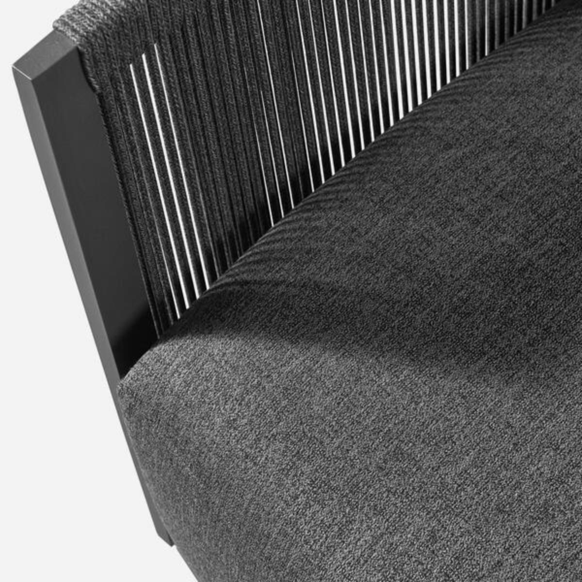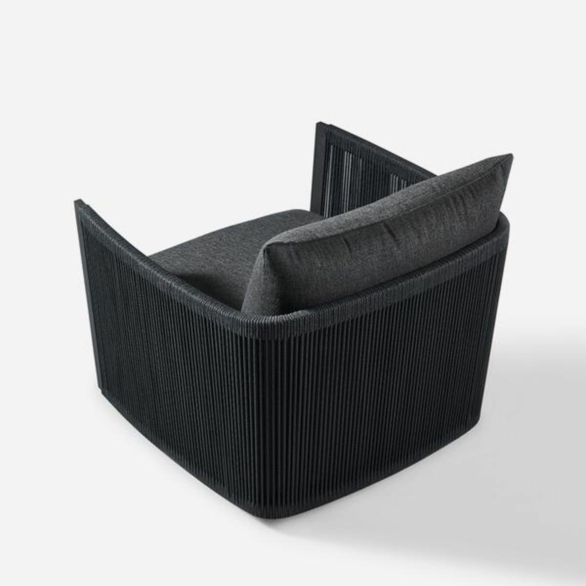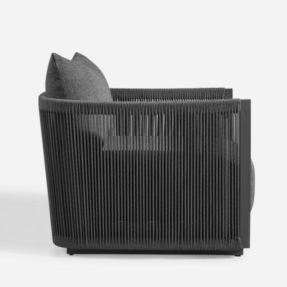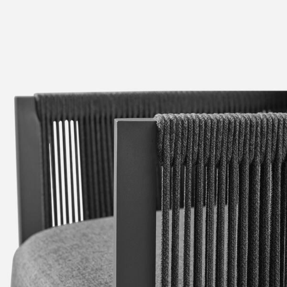 Relaxed outdoor armchair. Experience a taste of island life with our relaxed Bali outdoor armchair. The rounded corners of the back and arms are wrapped in woven rope for a laid back, organic feel with cushions to provide a soft and supportive seat. Upholstered in slate grey removable, cleanable, anti mould and waterproof fabric with outdoor foam fillings meaning is it is suitable to be left outdoors. Crafted in a graphite grey, powder coated and rust proof aluminium frame and specially engineered materials this piece brings luxury to your outdoor living area. Comes with a 5 year frame guarantee.