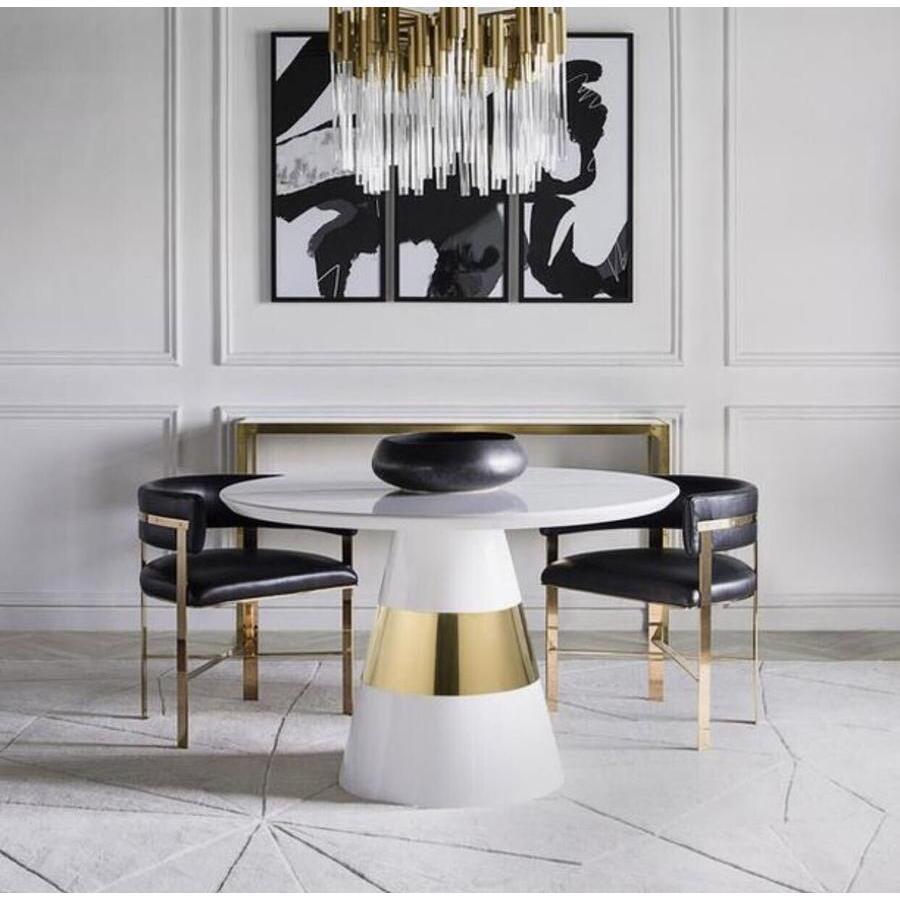 I love this dining table for its bold yet versatile design, making it a real statement piece in the right interior. Its clean, contemporary lines and striking gold accent make it perfect for modern, eclectic, or even luxe interiors. A practical styling tip is to keep the surrounding chairs minimal to let the table stand out, or mix up textures and colours in your seating for a more eclectic look. It works well as a centrepiece in open-plan living spaces or a sleek dining room, and pairing it with neutral tones can help highlight its shape and metallic detail. Just ensure lighting is sufficient to reflect its sophisticated finish and enhance the overall aesthetic.