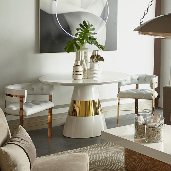 Designed by Kelly Hoppen MBE, the Band table is a versatile piece that works well as an entrance way or small dining table. Kelly's interpretation of the conventional occasional table incorporates high gloss, snow white lacquer and a mirrored brass band.