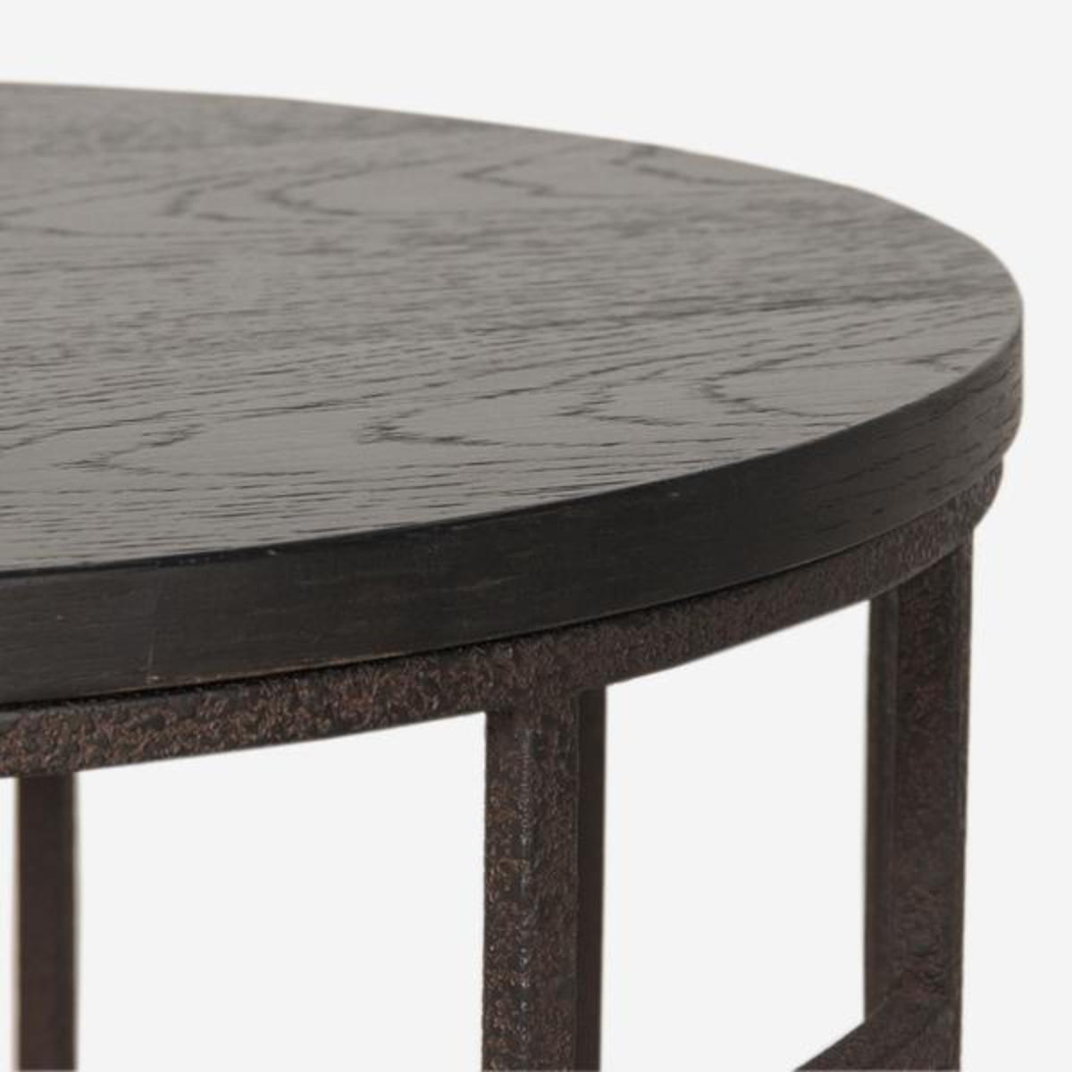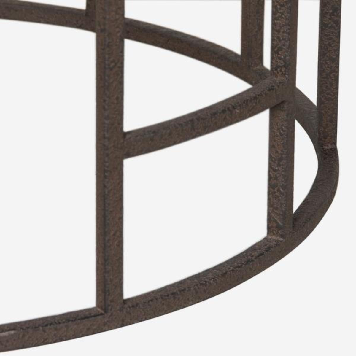 An urban design which puts just as much importance on the space and shadows it creates. Its frame is made from rusted iron piping which holds a wooden top in a matt black finish. The irregular rectangular shapes cut out of the frame juxtapose its overall circular form, making this a sculptural piece which blends the industrial look of a gas works with a modern piece of jewellery.