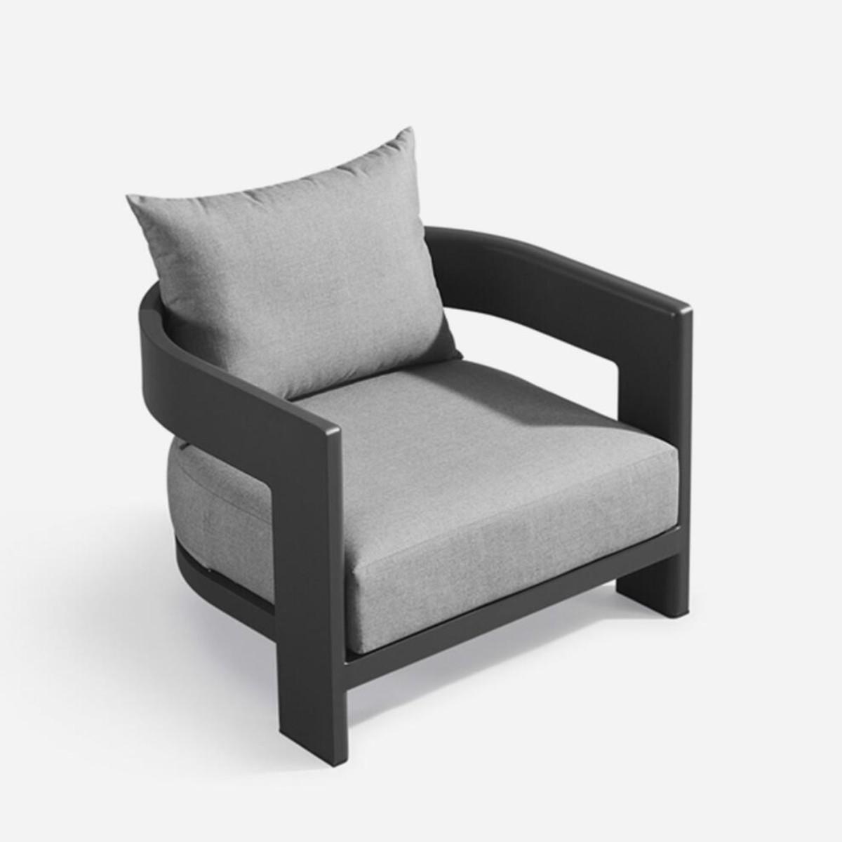 Our Caicos collection boasts a sleek modern design crafted from a dark grey, powder coated, rust proof aluminium frame. Upholstered in slate grey removable, cleanable, anti mould and waterproof fabric with outdoor foam fillings meaning is it is suitable to be left outdoors. The low slung style and curved, three leg design gives this piece a sculptural look, with a wide seat for a truly laid back feel. Perfect for creating a relaxing outdoor living area. Comes with a 5 year frame warranty.