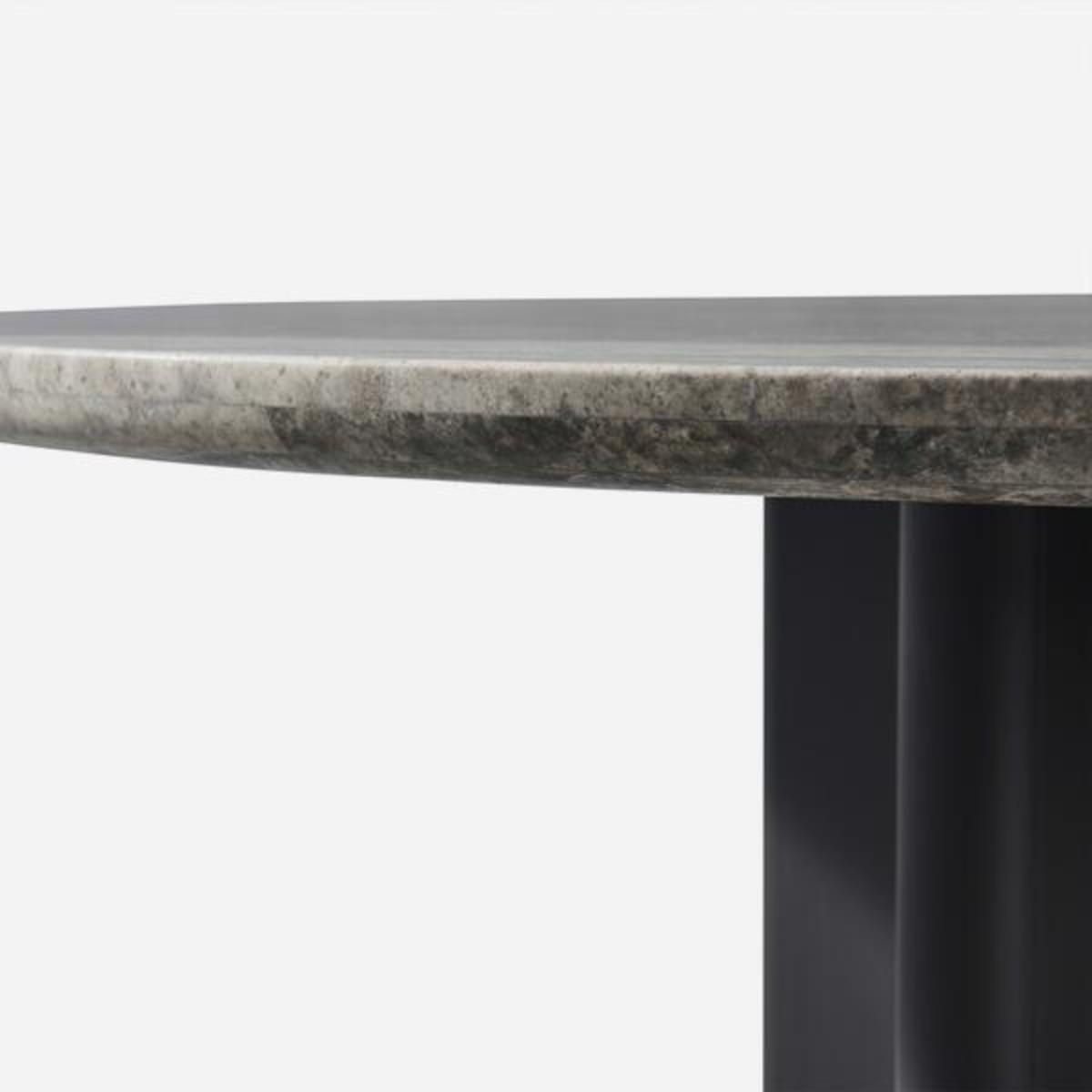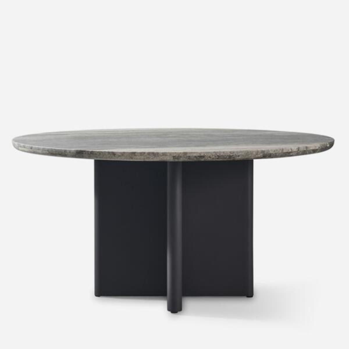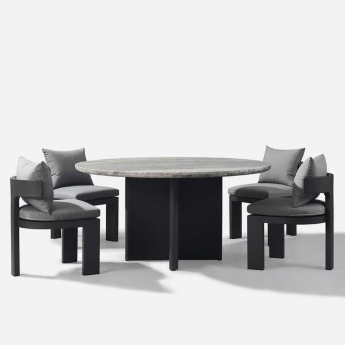 With a sleek, modern design this round dining table is the perfect centrepiece to your outdoor living area. The dark grey, rust proof, aluminium powder coated frame is specially engineered for exterior use and has a solid, rounded, pure travertine top with a luxury organic feel to compliment its natural outdoor surroundings. Comes with a 5 year guarantee.