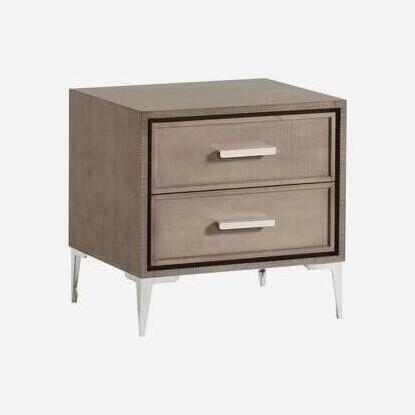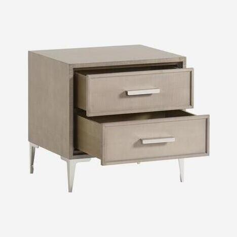 A polished bedside table crafted from a blend of taupe maple wood and figured sycamore veneers, finished in a luxurious satin mink. Evoke an air of feminine chic with this neutral contemporary luxe piece.
