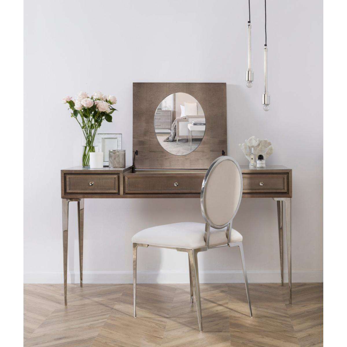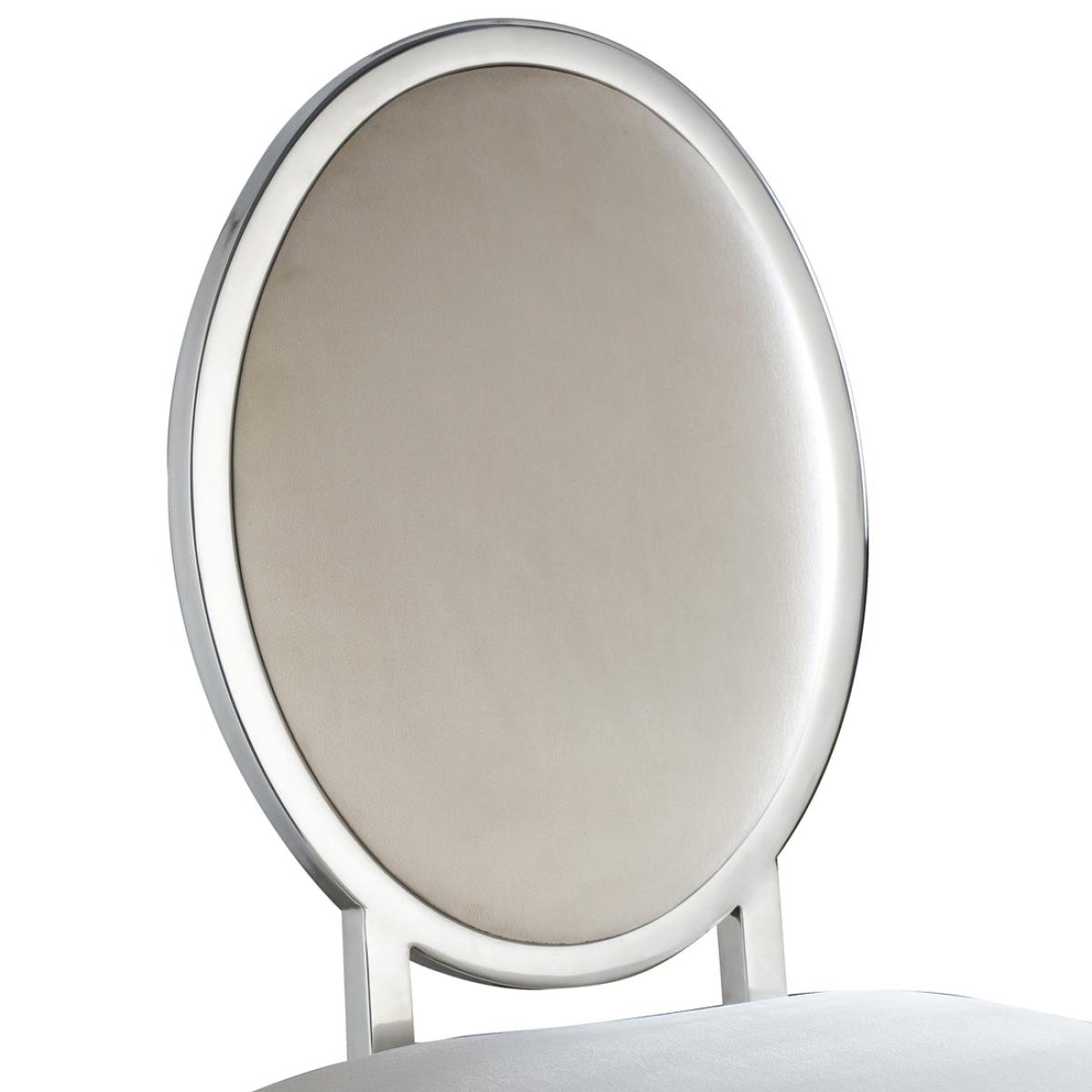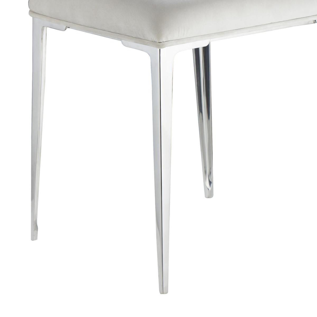 A contemporary take on a classically sculpted vanity chair in light neutral velvet fabric framed by silvery solid stainless-steel. Enhance the sleek lines of a minimalist contemporary space with this elegant piece.   Dimensions: H: 86 x W: 50 x D: 46cm Materials: 100% Polyester Care instructions: Wipe with a soft damp cloth, no harsh abrasives etc.