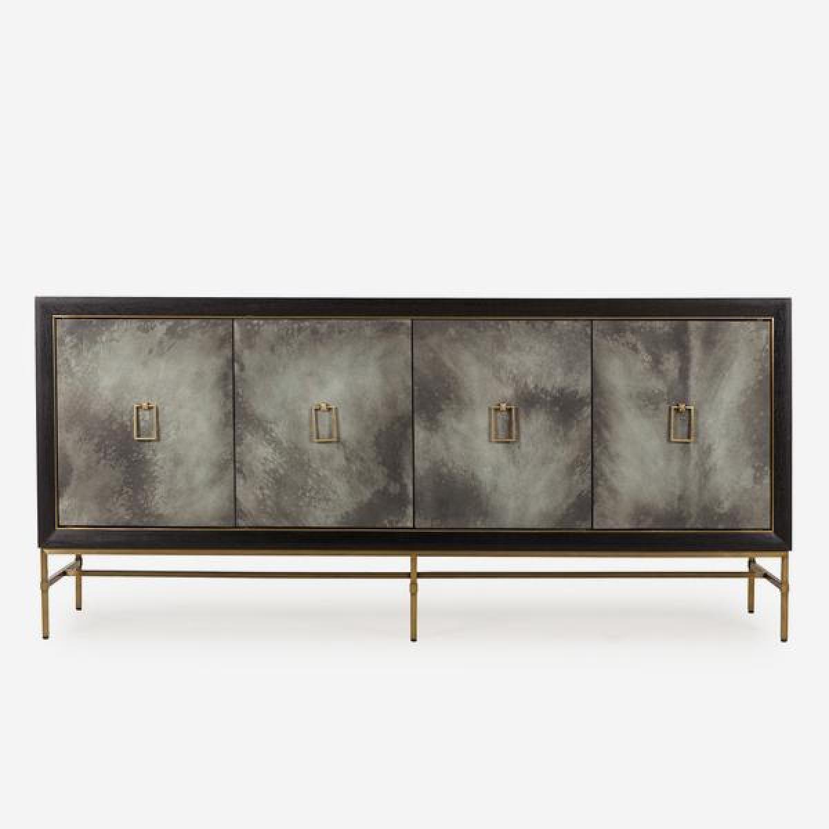 The Andrew Martin Edith cabinet is a stunning item featuring four cupboards, making it ideal for home storage. This matte black cabinet is made of wood and rests on a satin brass frame. The cupboar. View More. The Andrew Martin Edith cabinet is a stunning item featuring four cupboards, making it ideal for home storage. This matte black cabinet is made of wood and rests on a satin brass frame. The cupboard doors feature a natural charcoal wash and have feature handles, also in satin brass. Measuring 183cm wide, 51cm deep and 81cm high, this quality cabinet will suit a traditional style of home and blend easily with a range of décor and other furniture choices. Use it to store your personal belongings, electronic gadgets when not in use, and/or dining table accessories such as placemats and coasters.