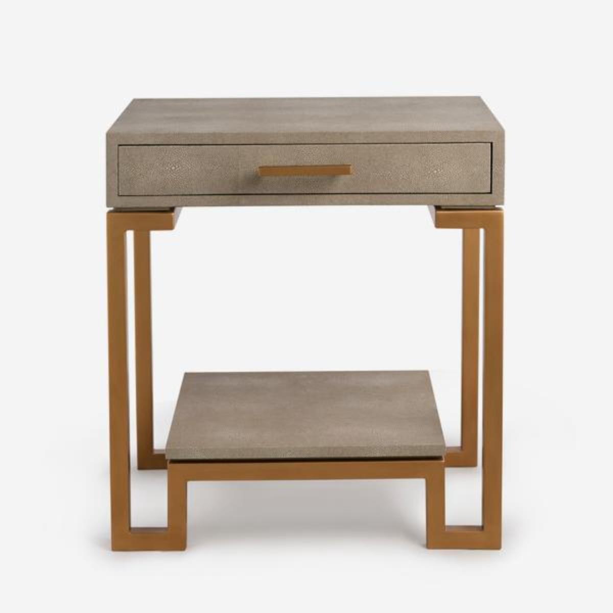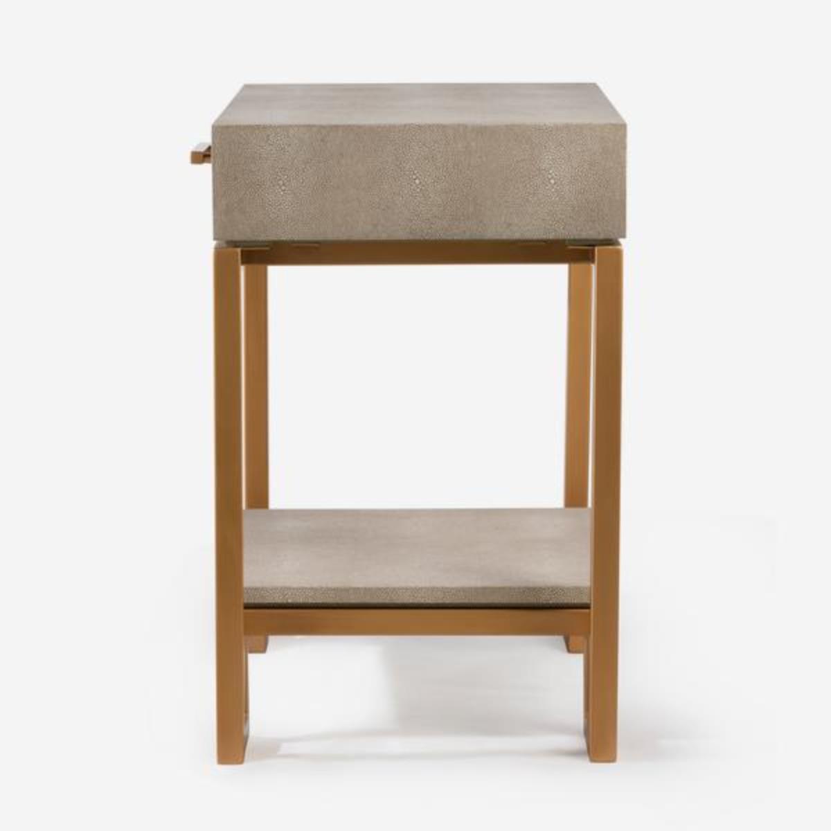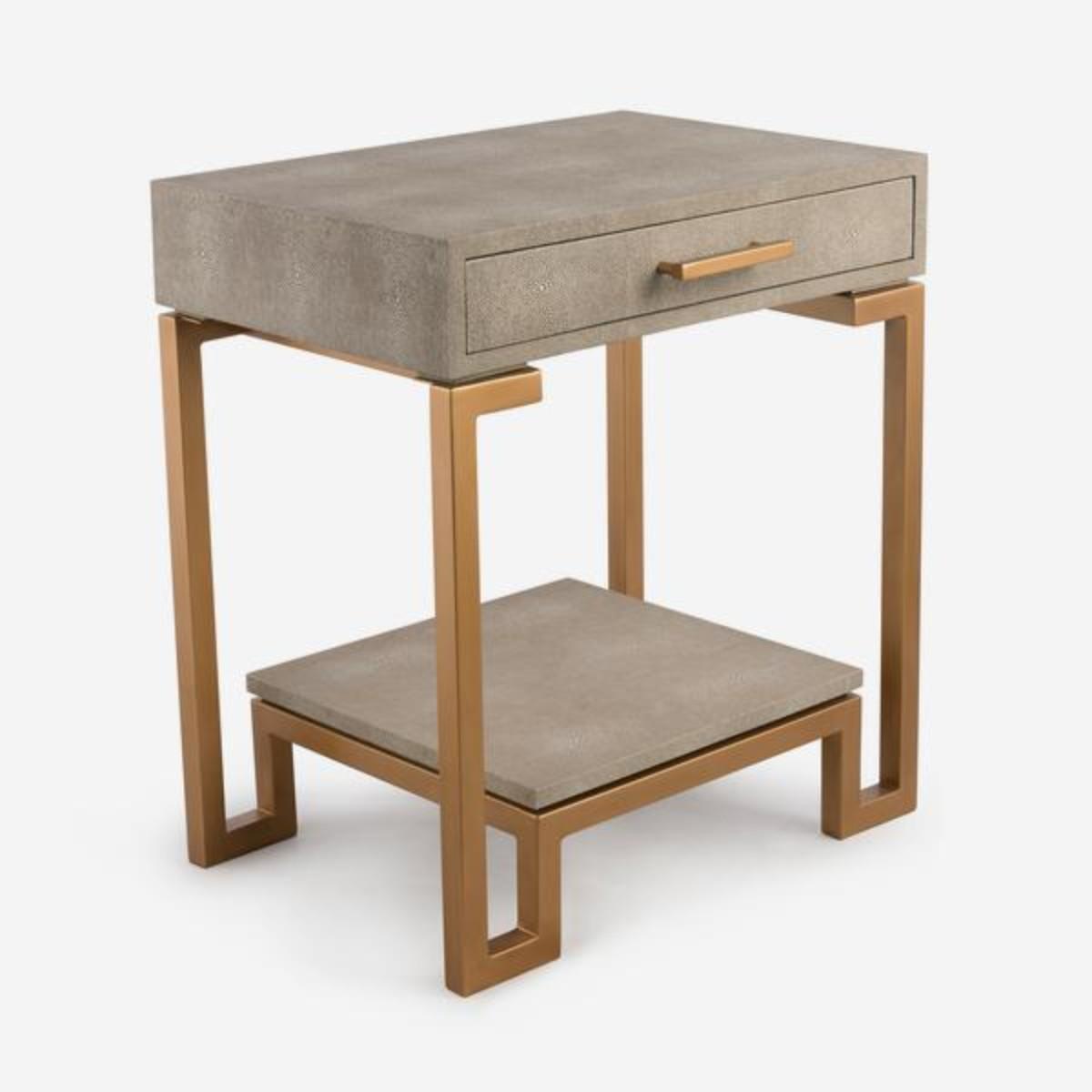 Faux-shagreen side table in cream. Flex Side Table features a faux shagreen box drawer top and undershelf in cream, standing on a smart gold finish frame with a handle to match. The geometric outline keeps your eyes guessing and creates strong lines and structure in a room, softened by the neutral tone and texture of the faux shagreen detailing.