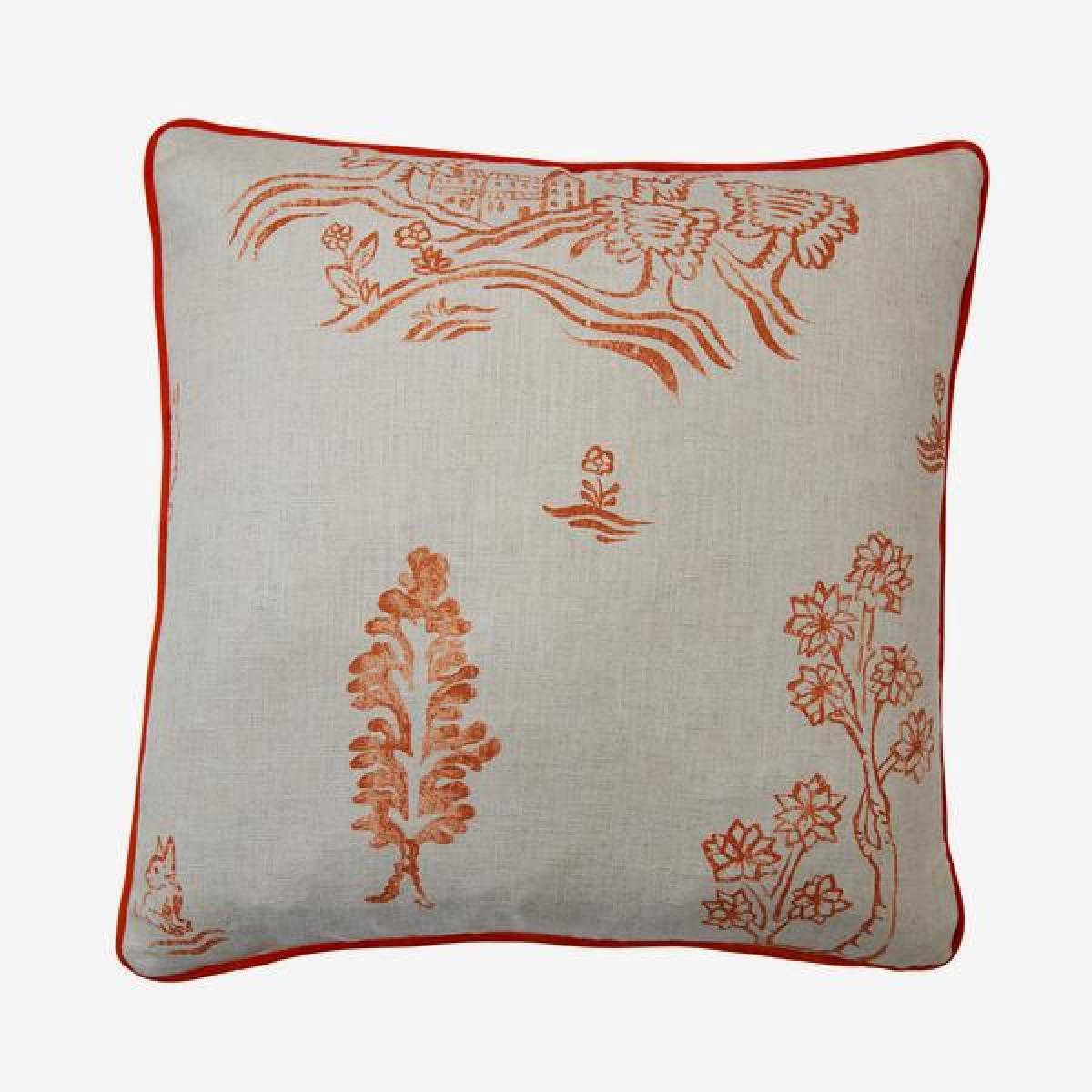 Inspired by 15th and 16th century tapestries, this Friendly Folk cushion, from our Kit Kemp collection, shows bushy tailed creatures peering amongst hedgerows, blooming trees and rolling English hills. With a rich sense of folklore and the lyricism of rural land, Friendly Folk is made contemporary with a vibrant orange motif. Handmade in the UK, filled with sustainably sourced duck feather and down and complete with vibrant orange velvet contrast piping. *Moot Trading Ltd is not a lender and acts only as an introducer. The credit product is provided by Klarna Bank AB (publ). Credit is only available to permanent UK residents aged 18 and over, subject to status. Terms and conditions apply. Please note that the following products are not regulated by the FCA: Pay in 30 days and Pay in 3 instalments. Read More.