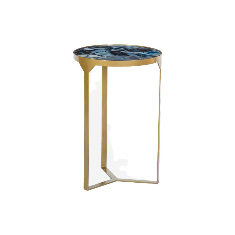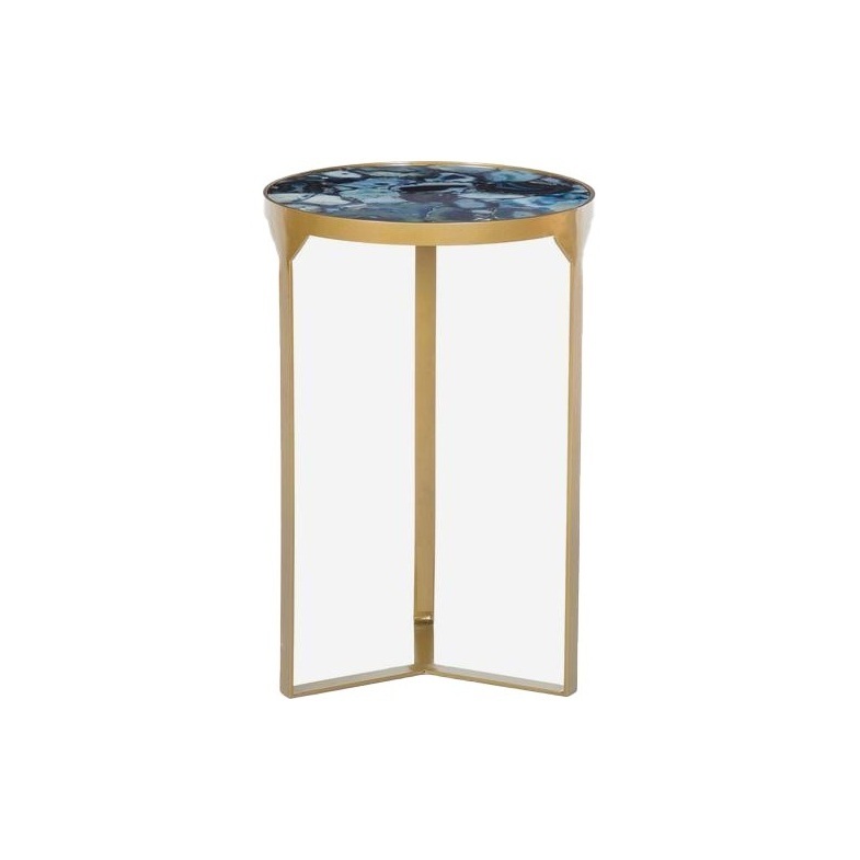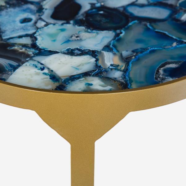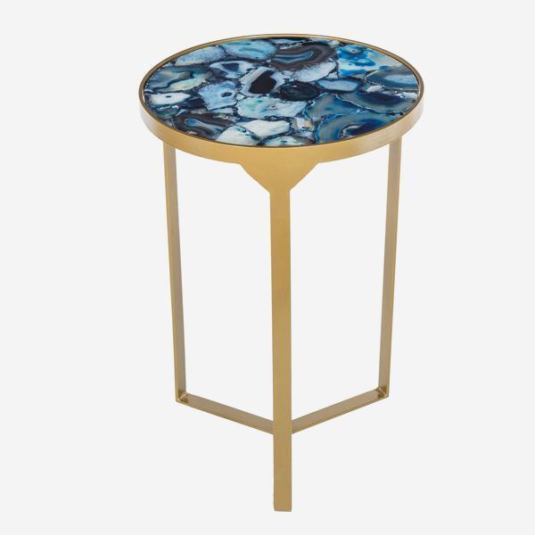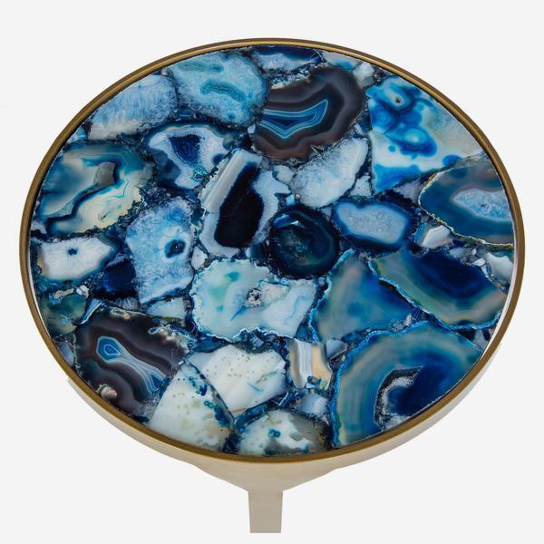 A stunningly elegant side table on three tall and slim antique brass legs. The circular top displays a collection of ocean blue agate whose varying colours and lines pull you into their beauty with mesmerising allure. It is not surprising that agate also has feng shui properties of balance and healing. Ida really is the powerful jewel of a room.