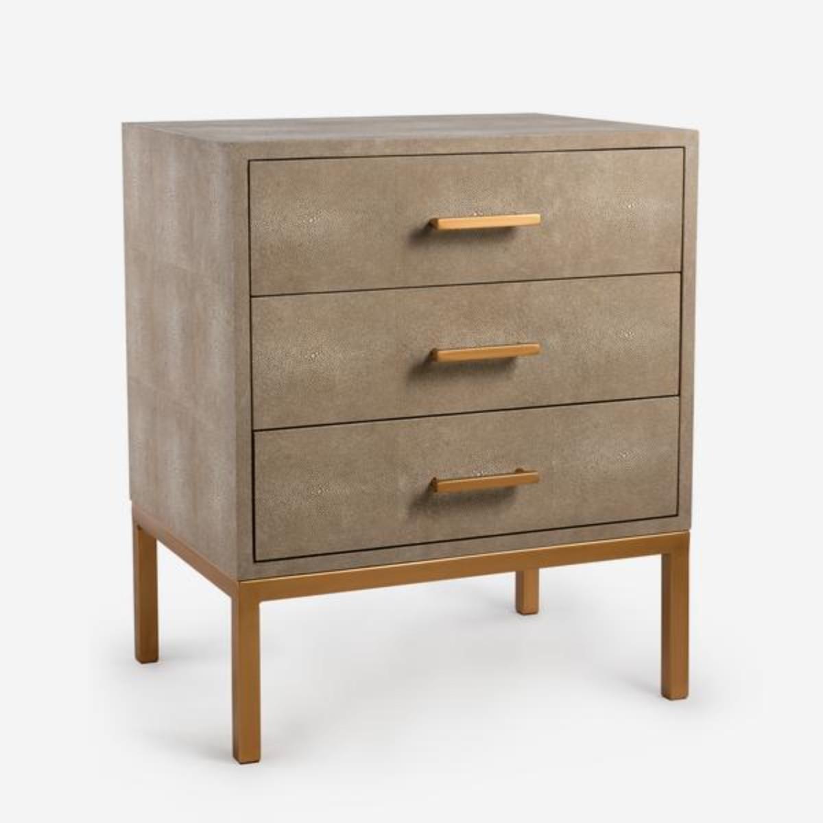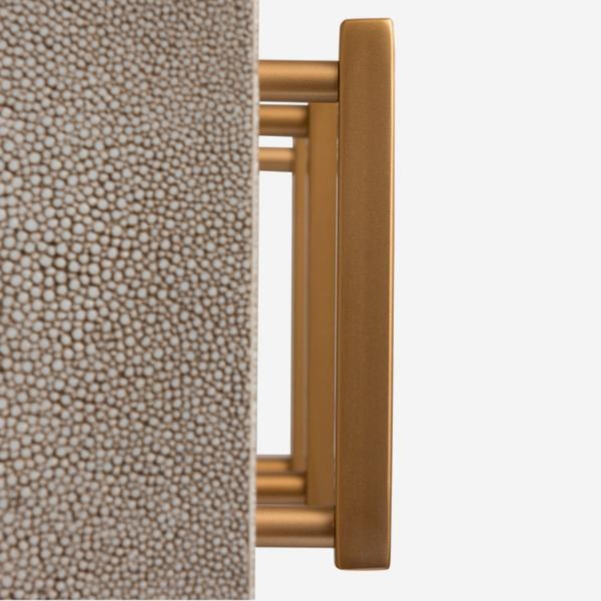 Jasper Side Chest boasts a classy faux shagreen finish in cream with matt gold legs and handles to match. Three pull out, soft close drawers make this side table practical as well as stylish and sophisticated. Perfect for a bedside table paired with a lamp that gives off warm, yellow lighting.