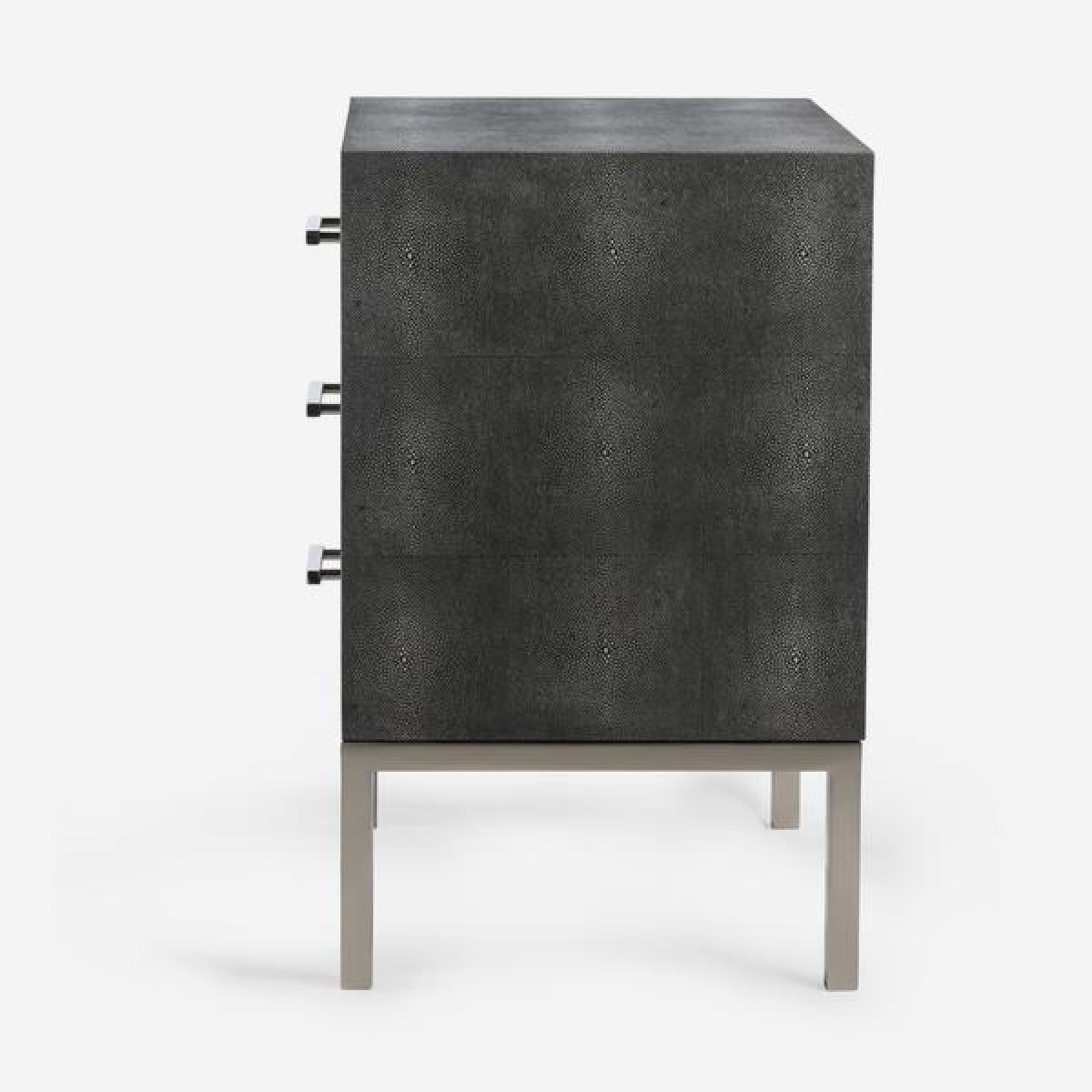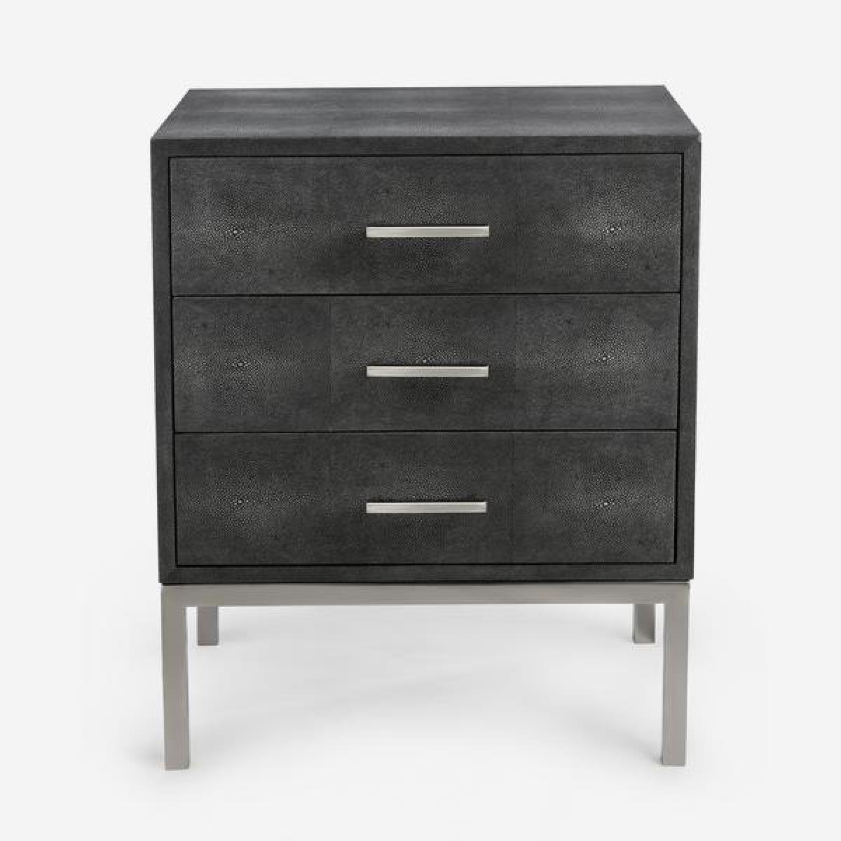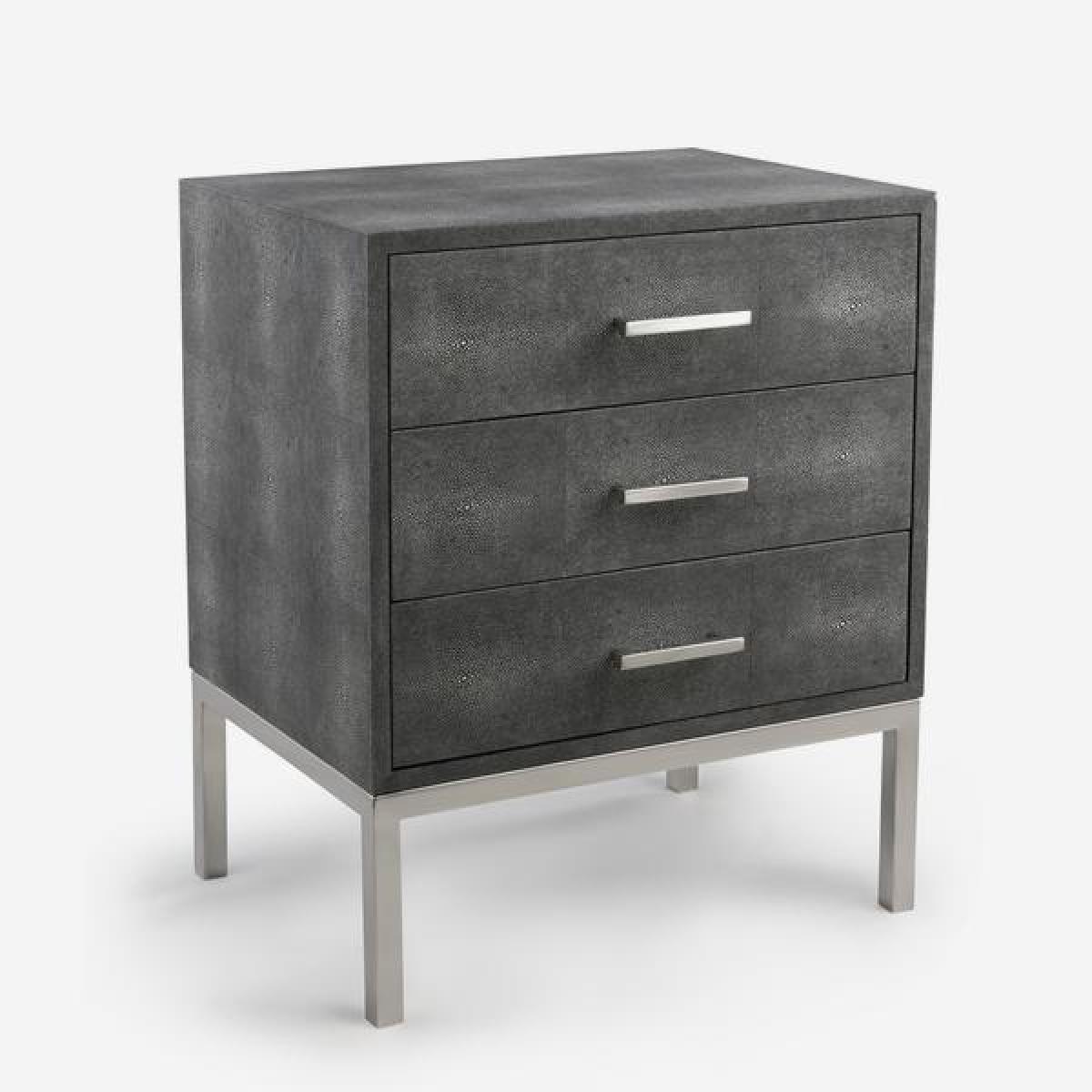 Jasper Side Chest boasts a classy faux shagreen finish in dark grey with matt silver legs and handles to match. Three pull out drawers make this side table practical as well as stylish and sophisticated. Perfect for a bedside table paired with a contemporary, sculptural lamp. *Moot Trading Ltd is not a lender and acts only as an introducer. The credit product is provided by Klarna Bank AB (publ). Credit is only available to permanent UK residents aged 18 and over, subject to status. Terms and conditions apply. Please note that the following products are not regulated by the FCA: Pay in 30 days and Pay in 3 instalments. Read More.