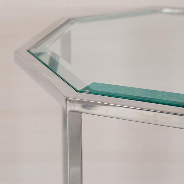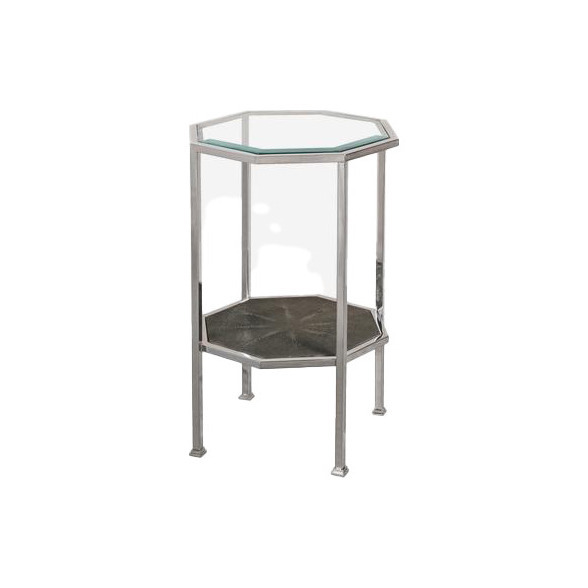 A nickel framed octagonal accent table topped in glass displaying the charcoal faux shagreen shelf below. This sleek piece will add some glamorous vintage flair to the side of your chair or sofa.