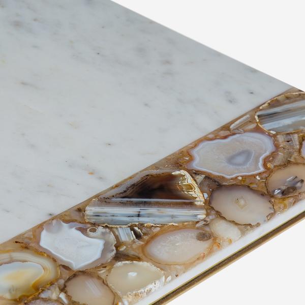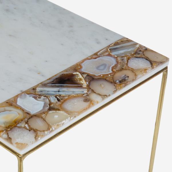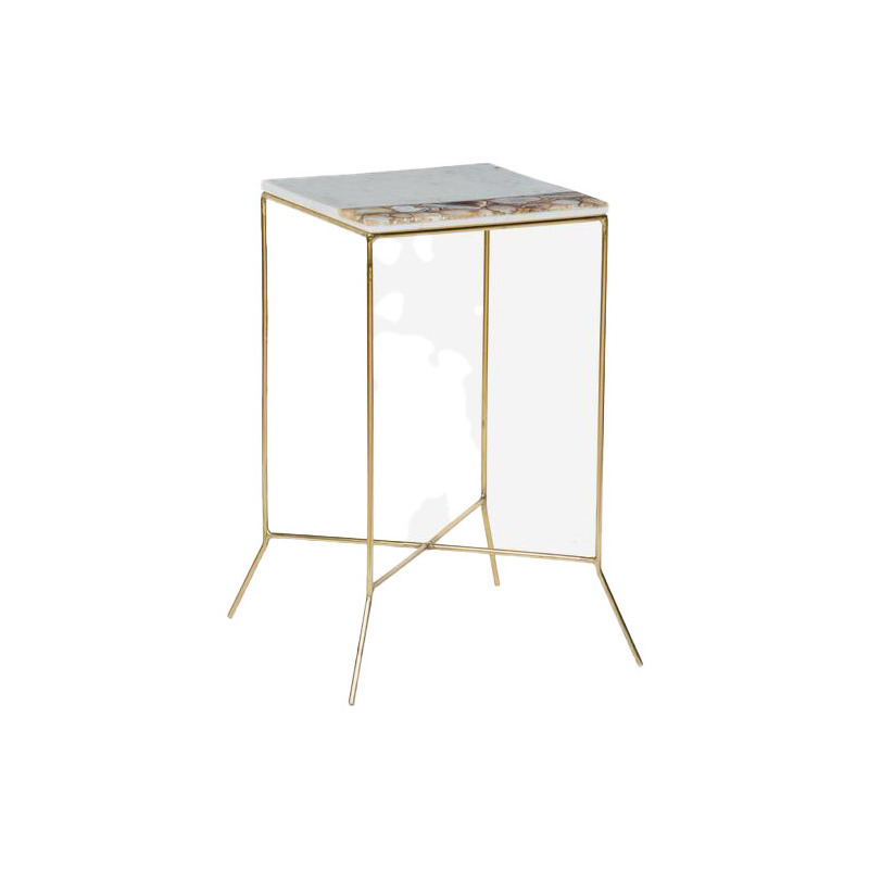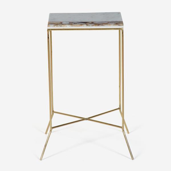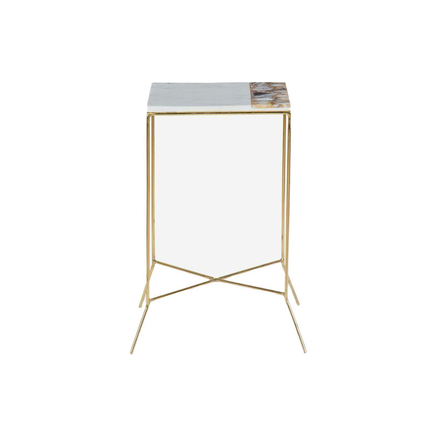 Rae side table stands tall on delicately slim brass finish legs which turn out at the bottom and feature a cross bar at the bend for stability and decorative detail. The square top in smooth marble is inlaid with a stripe of brown and yellow agate, creating a thematic colour scheme with the legs and adding tranquil elegance. Rae is the jewellery that tops off an outfit.