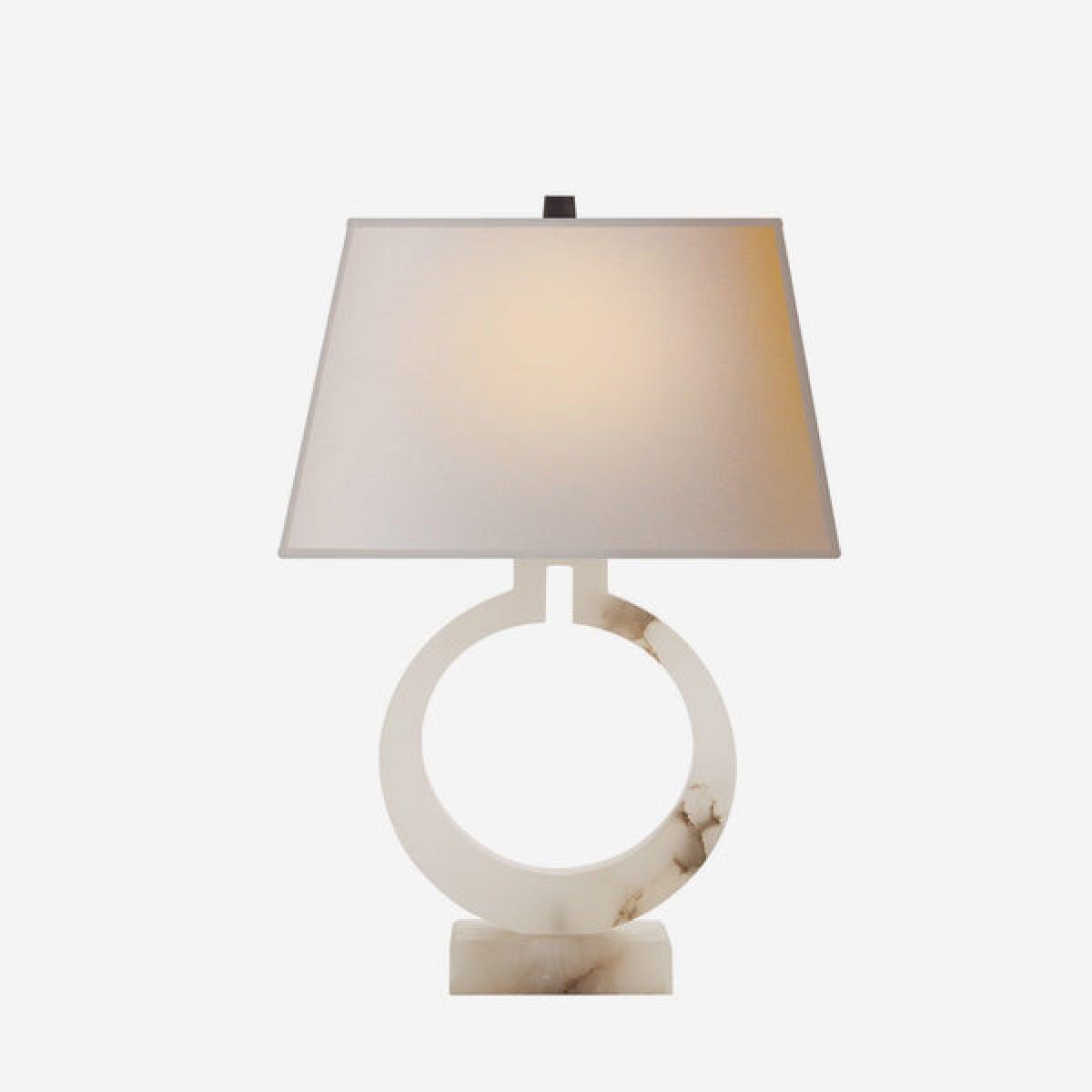 A characterful table lamp in alabaster, fashioned into a ring with a paper shade. Ring creates interesting shapes in a room, where the circular base contrasts the strong geometric shade. Designed by lighting icon E. F. Chapman, it beautifully combines traditional and modern. Available in two sizes. Requires 1 x E27 Max 60W Bulb - not included. *Moot Trading Ltd is not a lender and acts only as an introducer. The credit product is provided by Klarna Bank AB (publ). Credit is only available to permanent UK residents aged 18 and over, subject to status. Terms and conditions apply. Please note that the following products are not regulated by the FCA: Pay in 30 days and Pay in 3 instalments. Read More.