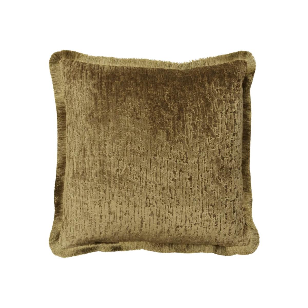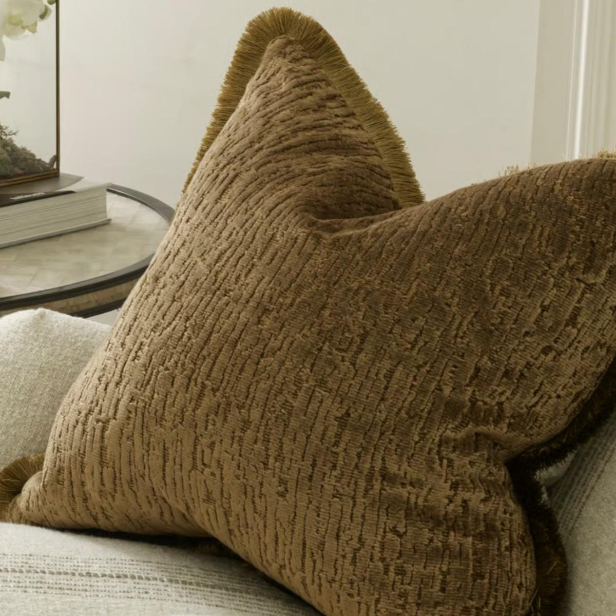 A glamorous two-tone cushion, fronted with Roma Bronze, a beautiful textured velvet named after the glamorous city of Rome and woven in a small mill near Como.