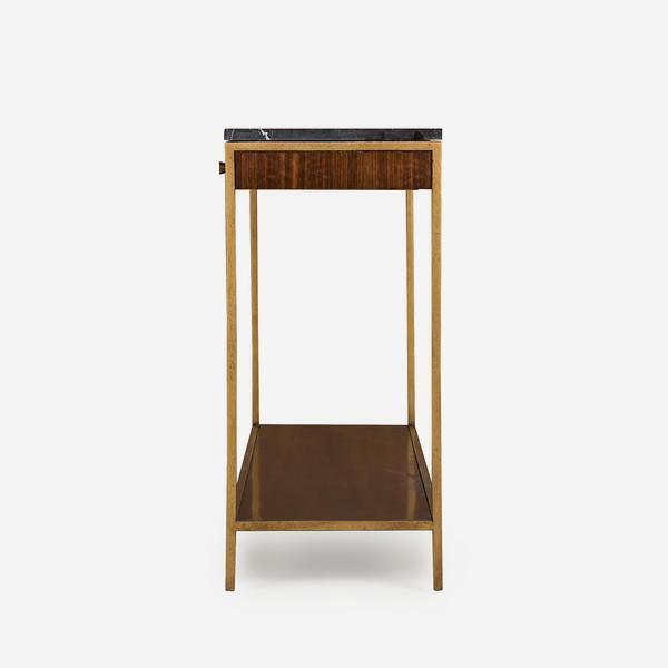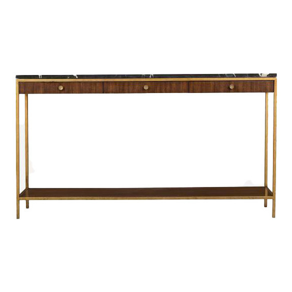 A stunningly Art Deco console table with a satin brass frame and honed marble top highlighted with white veining. Rufus includes three walnut drawers and bottom shelf for extra storage space. A dramatic piece with intricate marble detailing. In true 1920s style, Rufus is perfectly suitable for resting your cocktail glass as you pull out a long cigarette.