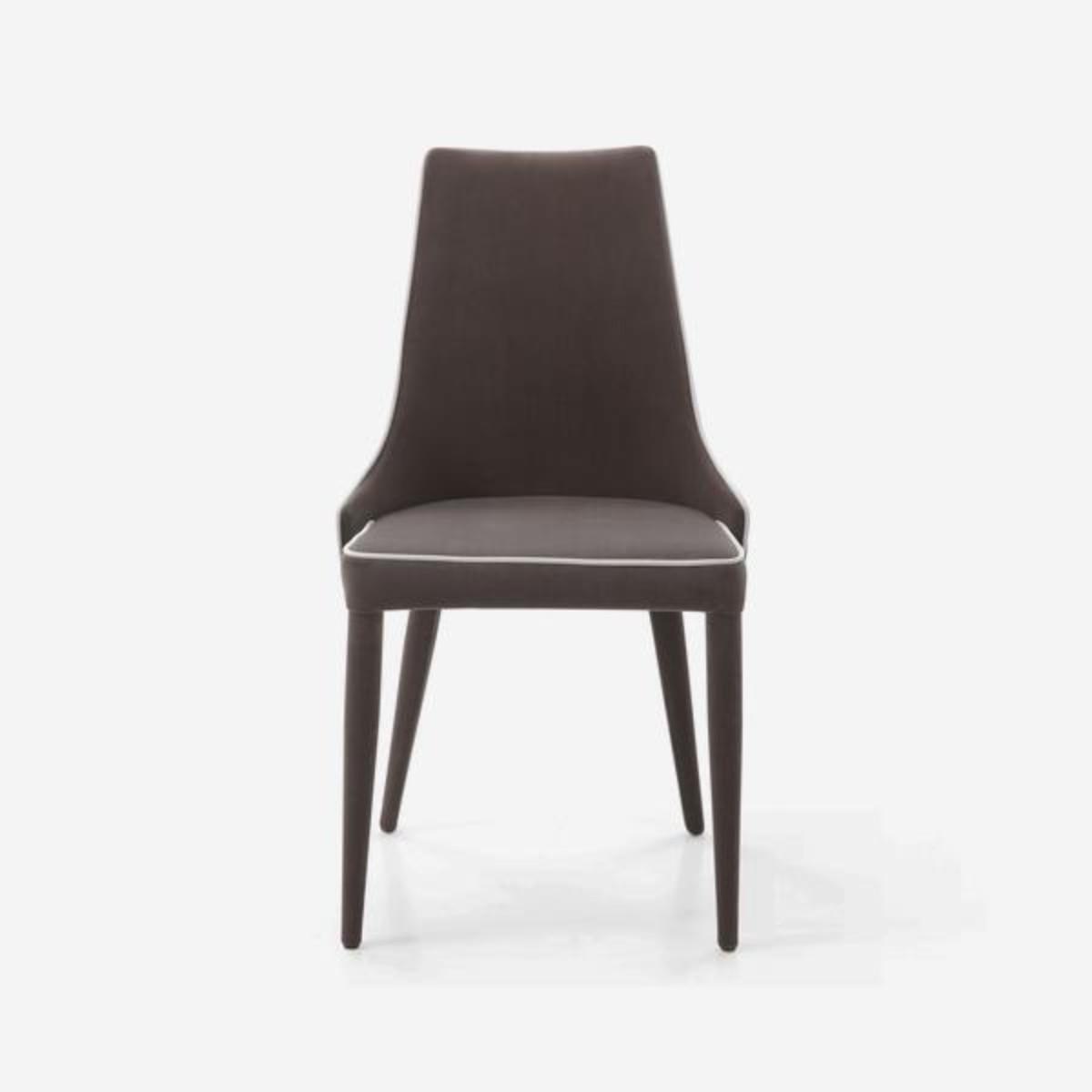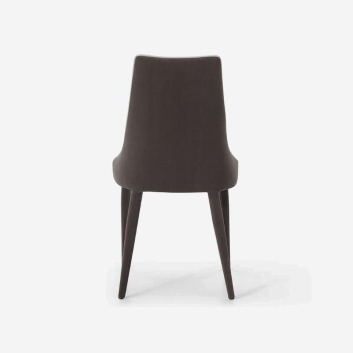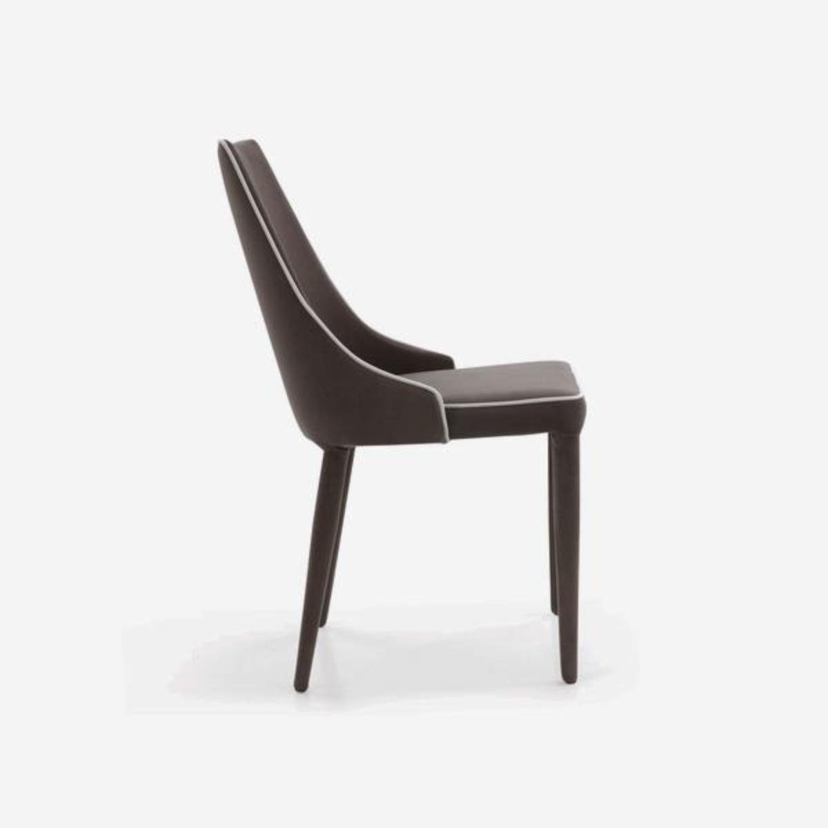 Smart contemporary dining chair in grey velvet. A smart dining chair in all over dark charcoal grey velvet with contrast light grey velvet piping. With a slimline armless back, the shape of Saber is smooth and stylishly mid-century. It adds soft texture and sophisticated detailing to a kitchen or dining room.