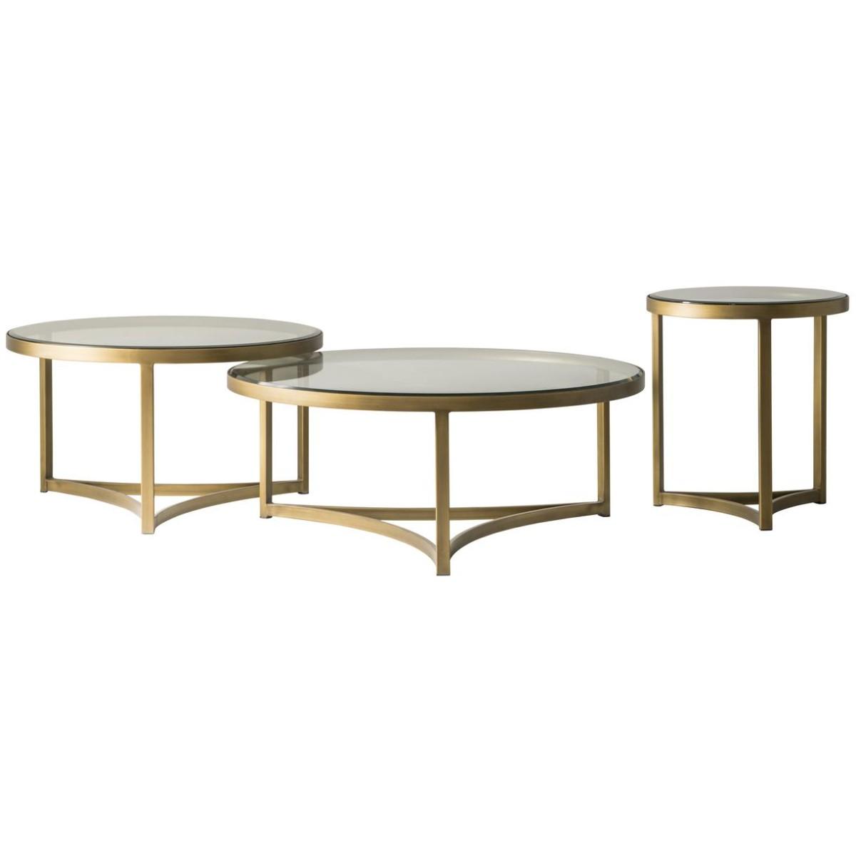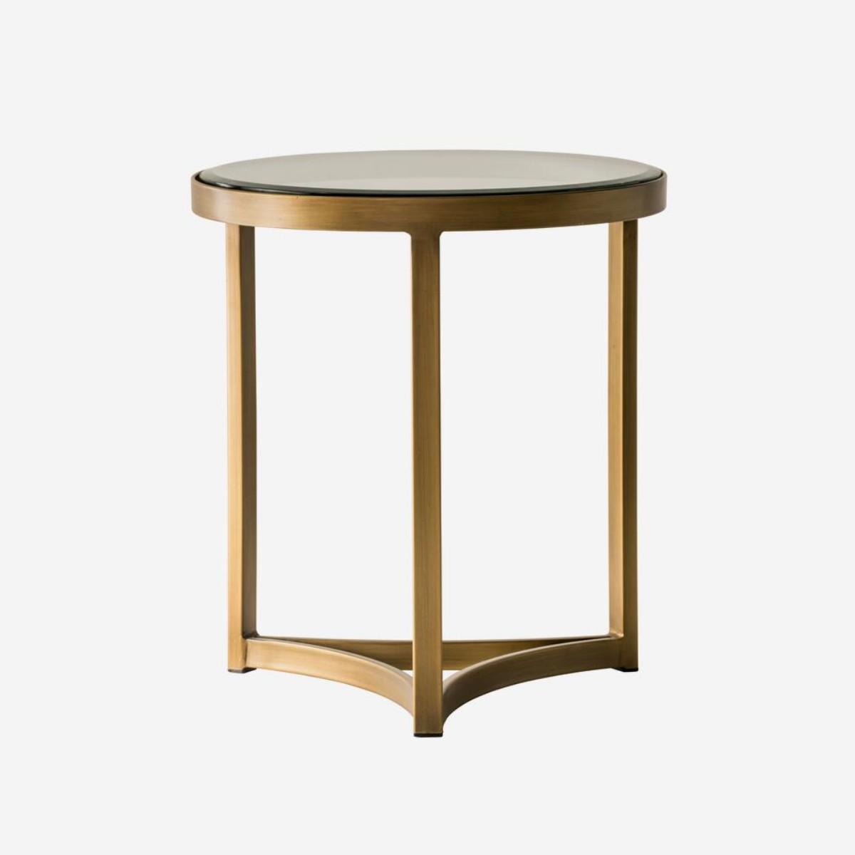 Sundance plays with curving lines. With a glinting antique brass finish, the circular frame of the top inverses underneath to display three concave lines at its base. The tempered glass top is cool and classy and allows the round sun-inspired design to shine through. Also available as a Coffee Table, in a Medium and Large size.