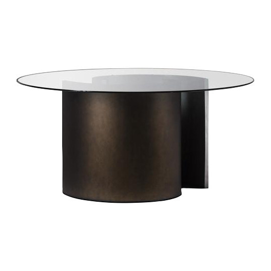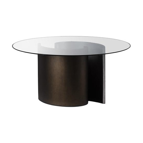A striking dining table curled in the shape of the number 69. The smooth glass top sits gracefully on a pewter and antique bronze base making this piece a chic contemporary addition to a masculine space.