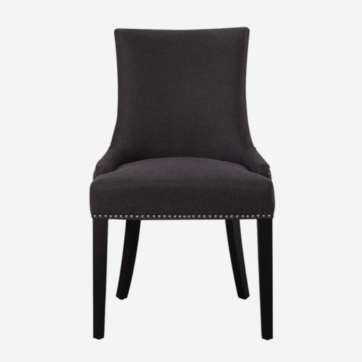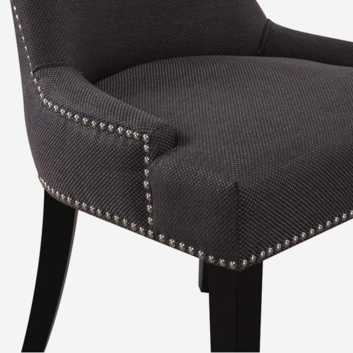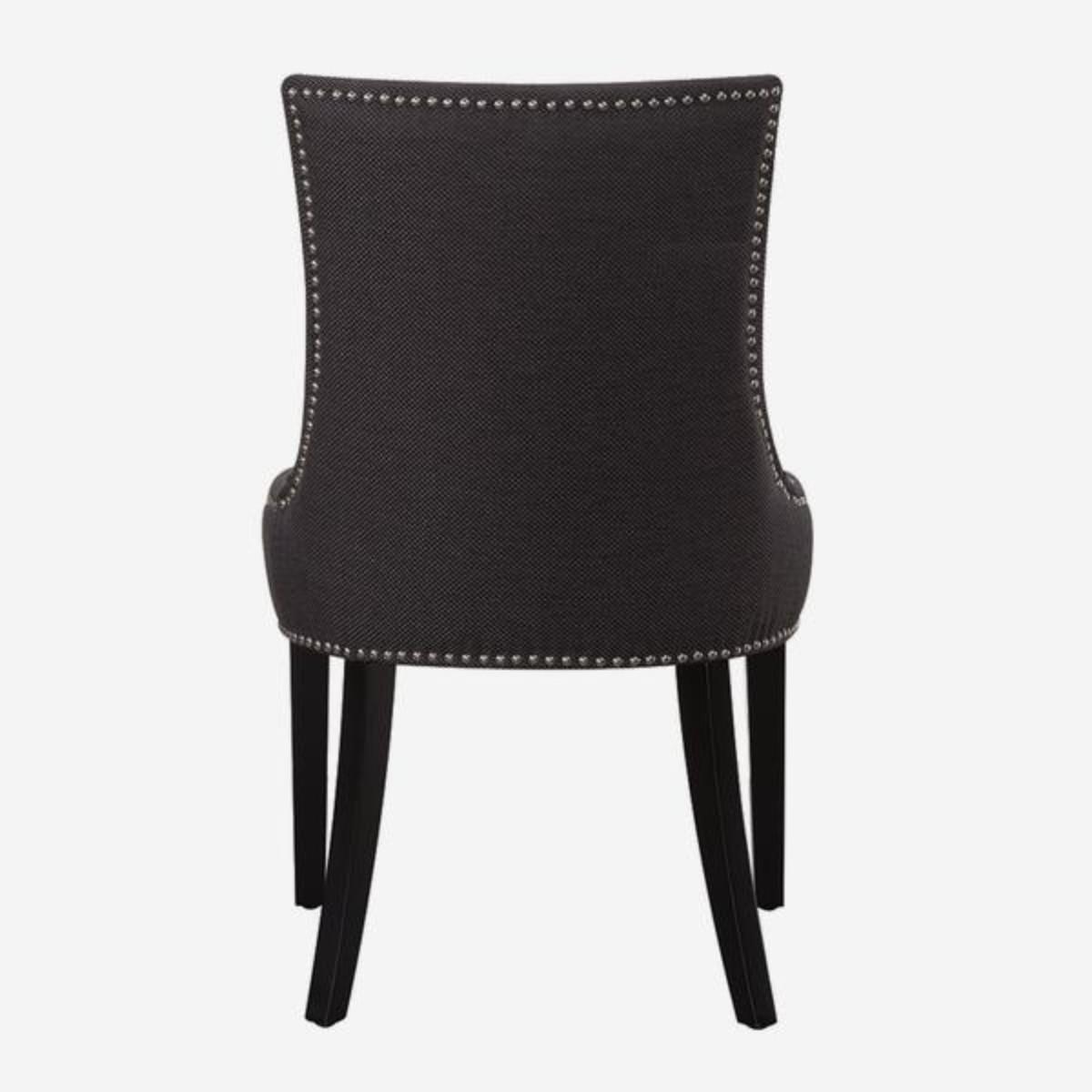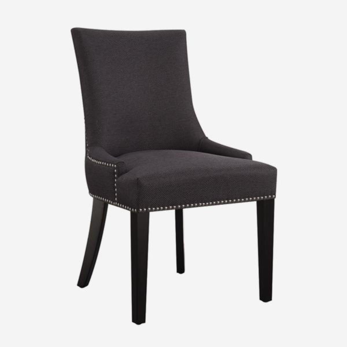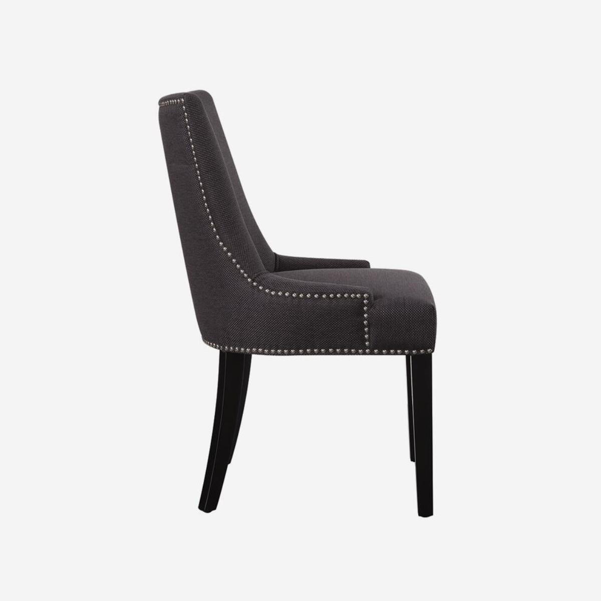 A dining chair which seamlessly combines style, comfort and practicality. Theodore boasts a scooped back and comfortable cushion seating. It is upholstered in a durable black threaded weave and displays smart silver stud profile detailing for added glamour. It features wenge legs, which curve outwardly at the back, and have protective under pads for scratch-proofing.