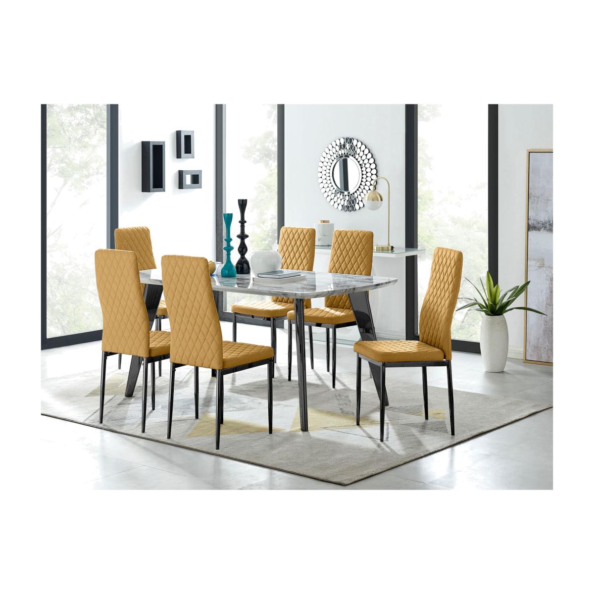 The Andria dining table is a statement piece for the interiors connoisseur. It oozes luxury and opulence. Boasting a 160cm x 90cm tabletop made from marble effect veneer, (which is right on trend and easy to maintain) it offers plenty of room for dining, seating up to 6 people. The smooth curve of the tabletop ends soften the shape beautifully, a perfect design feature for those with young children or grandchildren (of table edge head height!). Available with gold-effect or black legs, this beautifully designed dining table will set the scene for a stylish and luxurious room. Upholstered in soft touch mustard yellow velvet and finished with diamond pattern stitching the Milan dining chairs would seamlessly fit in with most dining spaces, whilst not compromising on either style or comfort. The stylish black powder coated metal leg and hatched velvet combination gives this chair a contemporary edge, whilst it's simple design allows for practical everyday usage. The chairs are made from high quality durable velvet that's easy to keep clean and are ergonomically designed for maximum comfort and support. They feature a deep foam seat cushion and plastic feet to protect the floor from any damage! At an unbeatable price you cannot go wrong with these chairs!