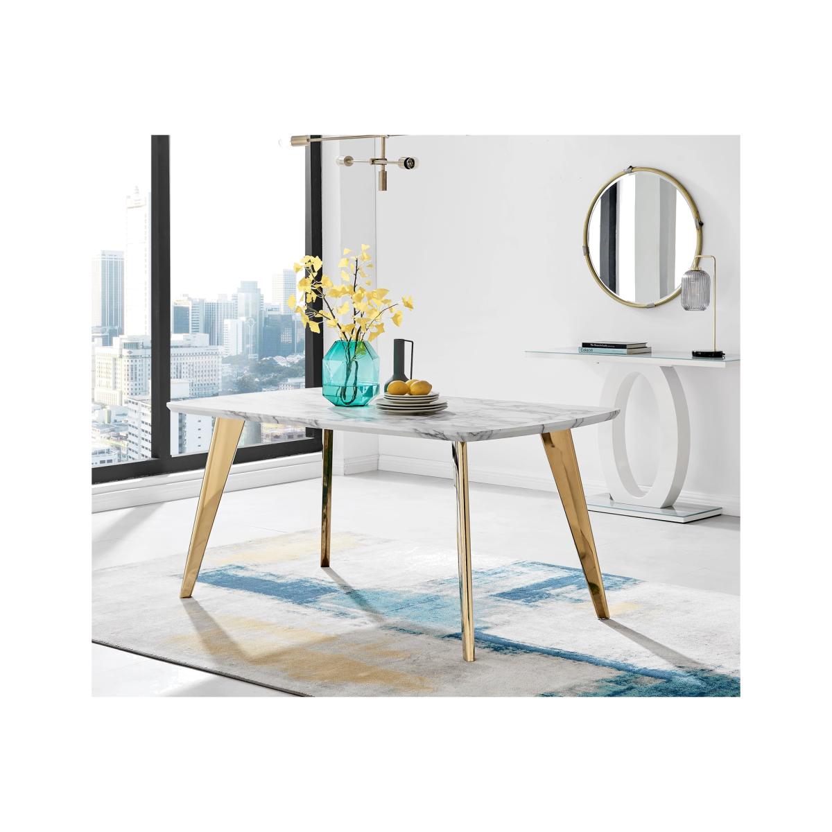 The Andriadiningtable isa statementpiecefor theinteriorsconnoisseur. It oozes luxury and opulence. Boastinga 160cm x 90cmtabletopmade from marble effect veneer,(which is right on trendandeasy to maintain)itoffers plenty of room for dining,seatingup to 6people. The smooth curve of the tabletop endssoftenthe shape beautifully, a perfect design feature for those with young childrenor grandchildren(of table edge head height!).Available with gold-effector matt black legs, thisbeautifully designeddining tablewillset the scene for a stylish and luxurious room.