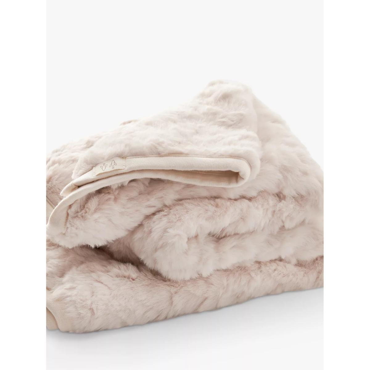 I love this fluffy baby blanket for its cosy, inviting texture and versatile taupe hue. It works well in both contemporary and classic interiors, adding a soft touch to nursery or bedroom schemes without overpowering other colours or patterns. Practical styling tips include draping it neatly over the end of a cot or spiralising it in a basket for easy access. Its faux fur finish offers a cosy feel, perfect for colder months, while its neutral tone makes it suitable for multi-colour themed rooms or minimalist schemes. The ribbon tie is a charming detail that keeps it tidy when not in use, making it as functional as it is cosy.
