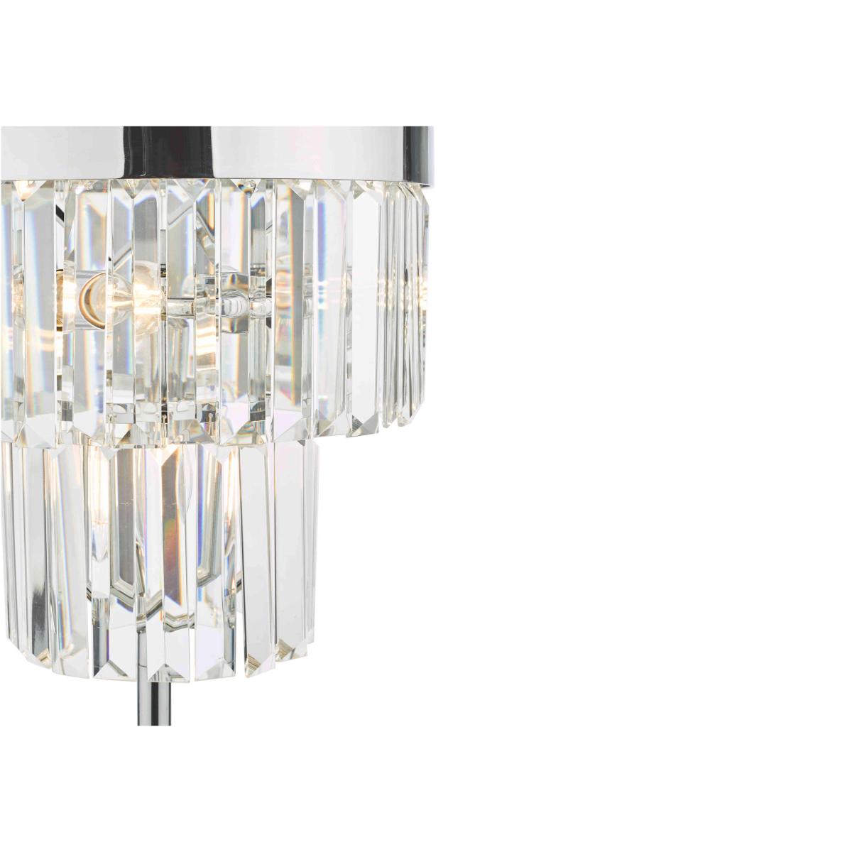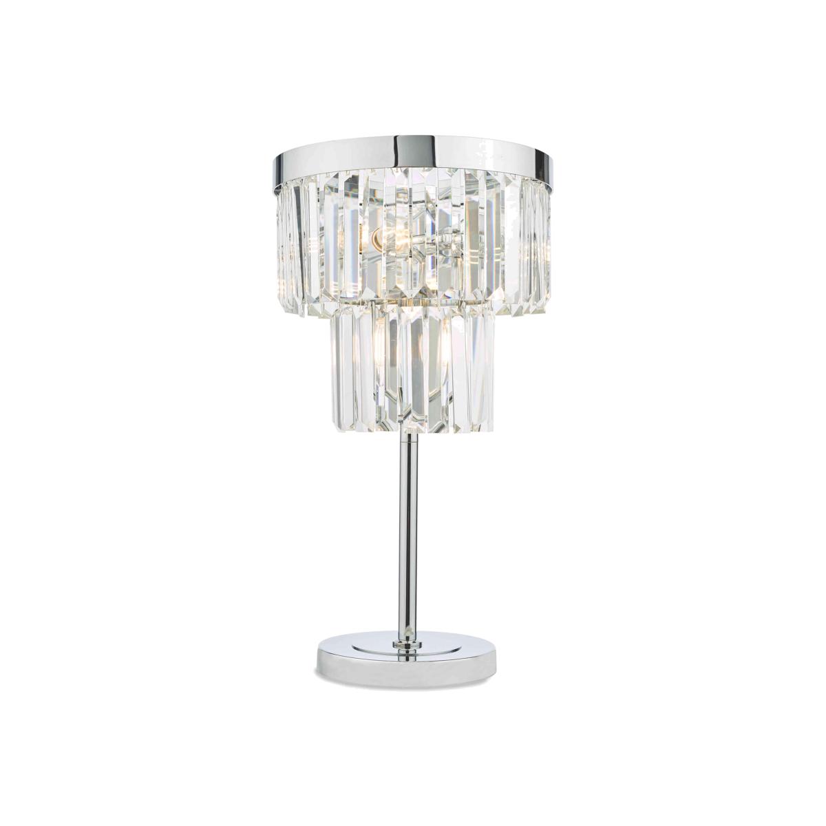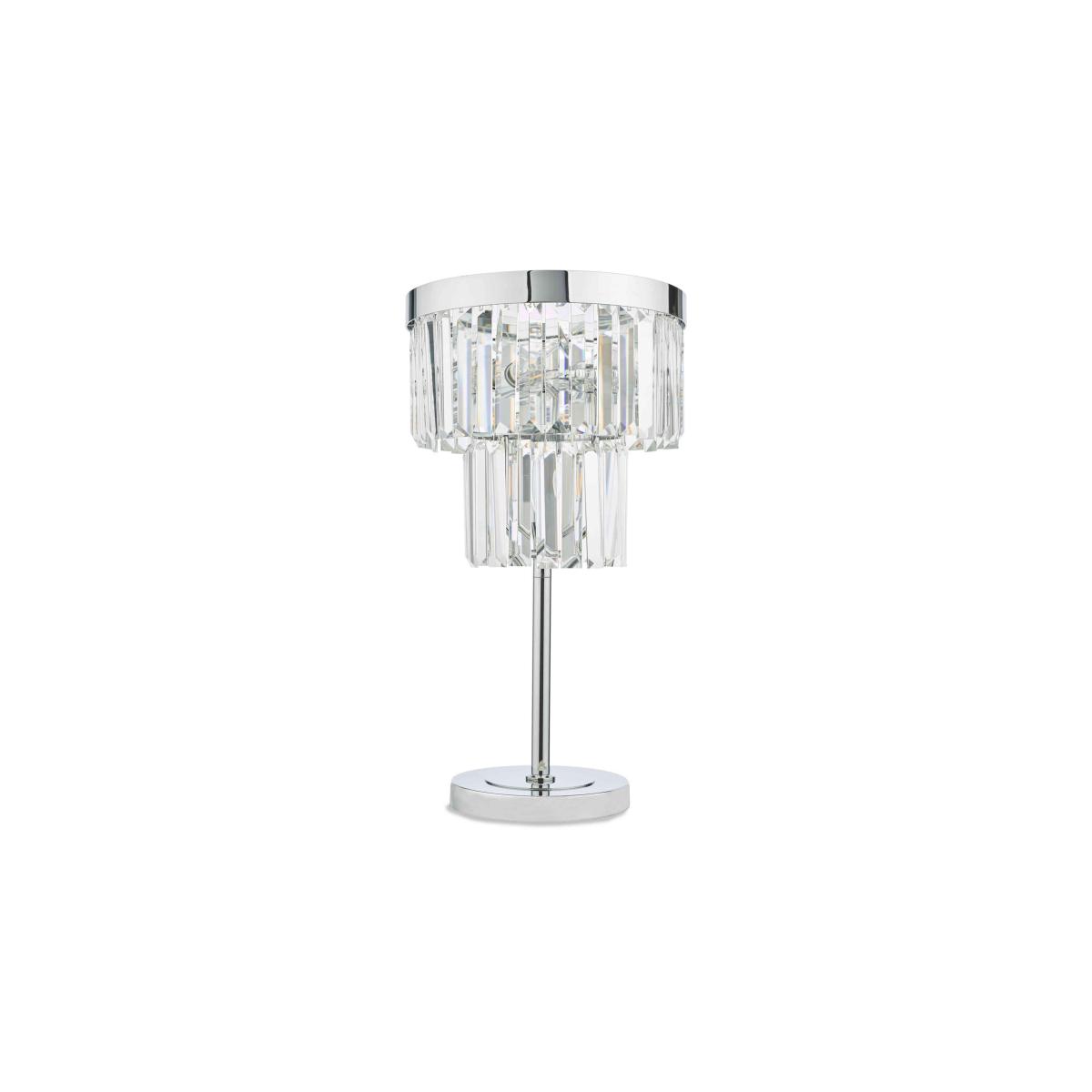 Bevelled crystals cascade from a bright, polished chrome frame in this stunning table lamp. Only at Furniture Village. Why you'll love it Every part of this showstopping crystal table lamp sparkles. Beautiful and glam. Bevelled crystals are suspended from a 2-tier frame. Polished chrome base and frame. Exclusive to Furniture Village. This table lamp is part of the Furniture Village lighting collection. What you need to know Metal and glass. Supplied with 100 cm cable. Inline rocker switch. Requires 1 x E14 SES max. 40W bulb (not included). Dimensions Height: 50 cm (20 in). Diameter: 28 cm (12 in).
