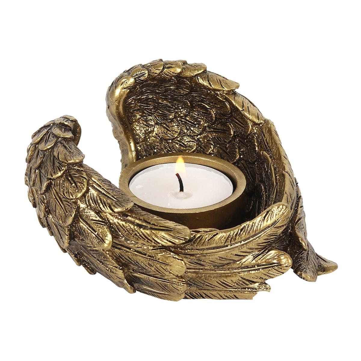 A beautiful angel wing candle holder for tealights or small votive. Features a stunning antique gold finish that's elegant and eye-catching.