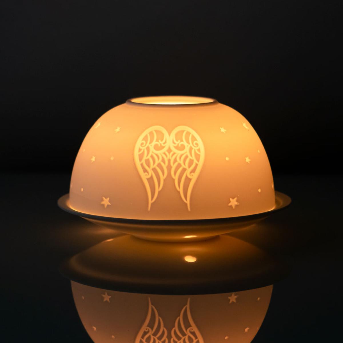 A beautiful white tealight holder with a ceramic dome and a delicate Angel wing design.