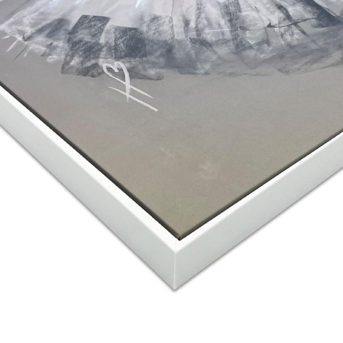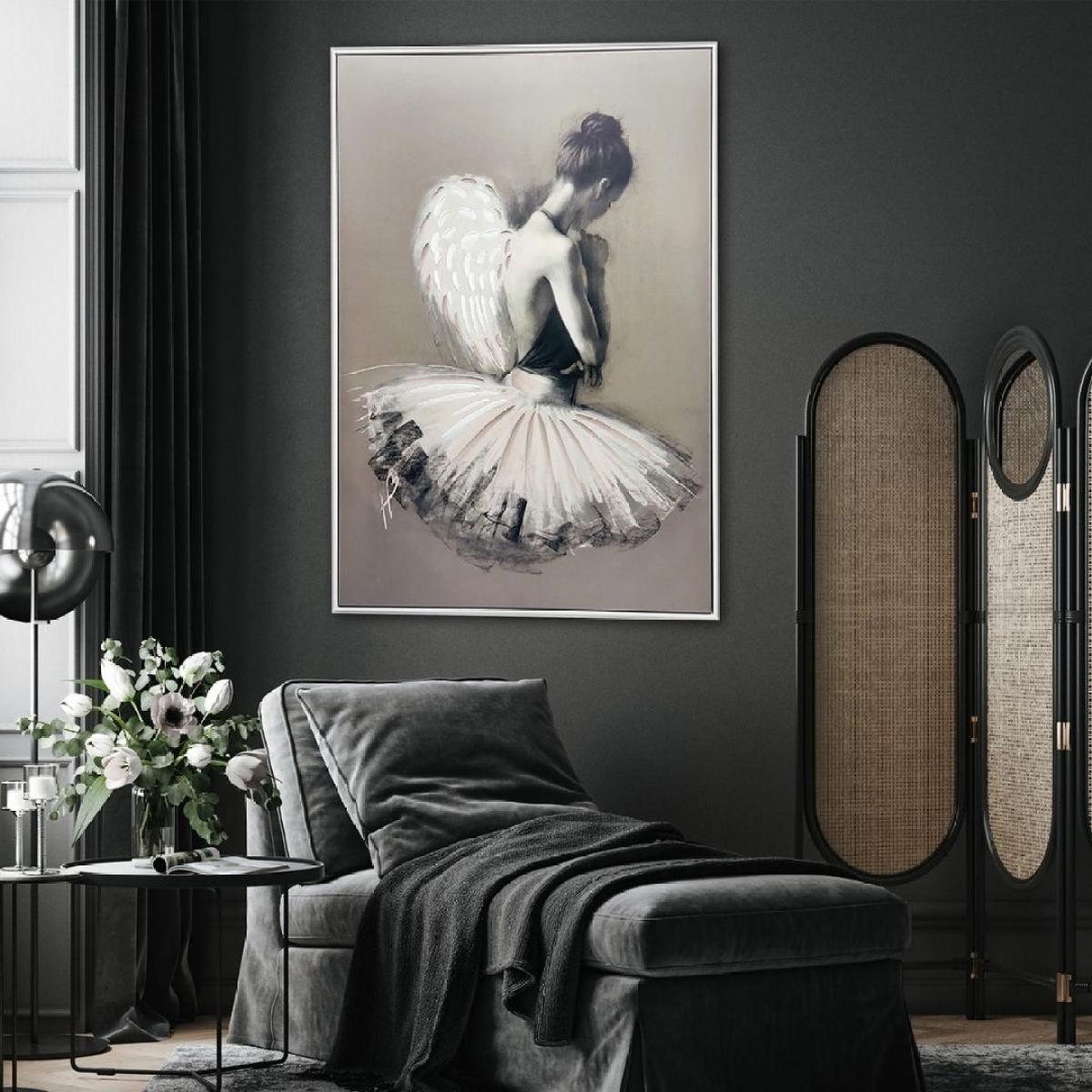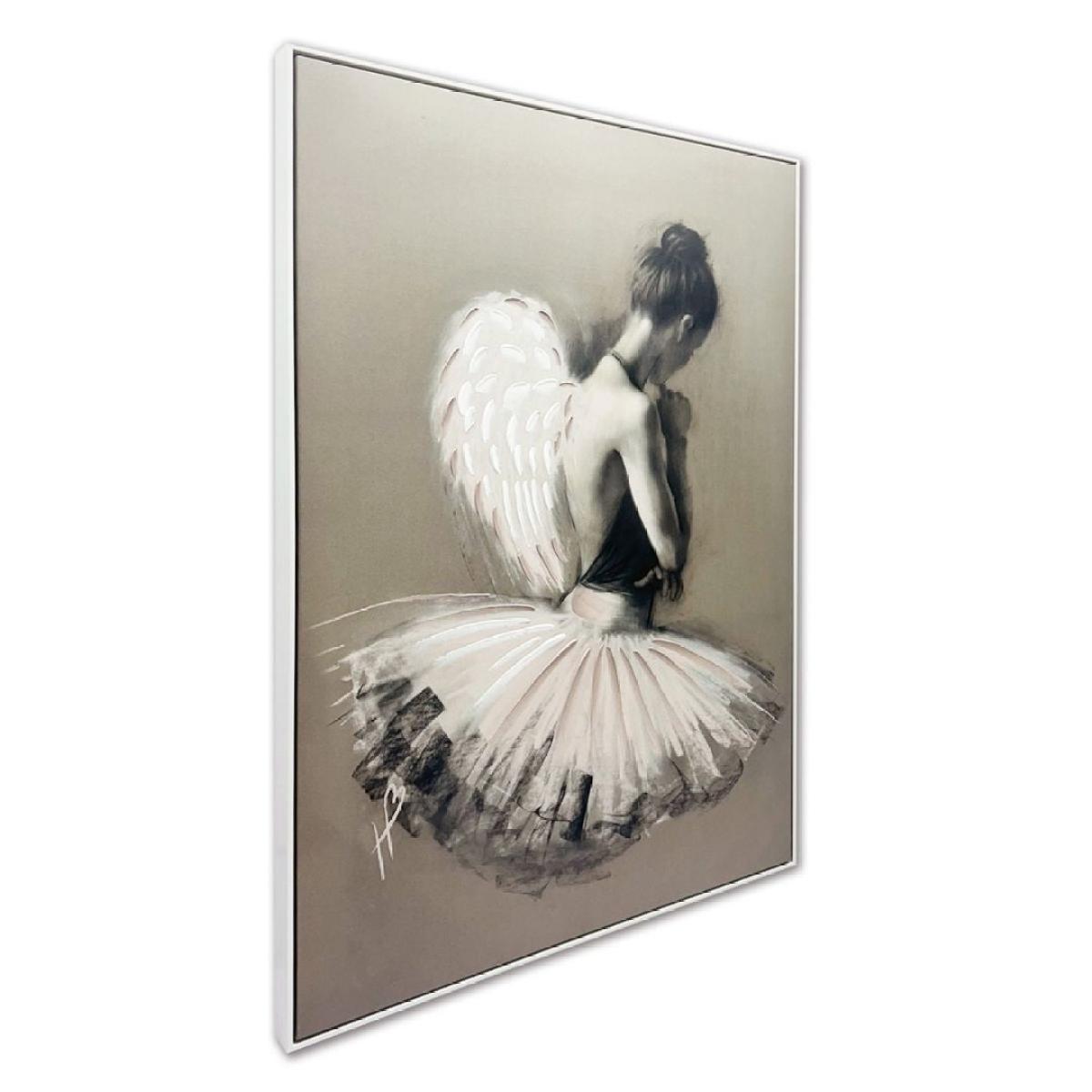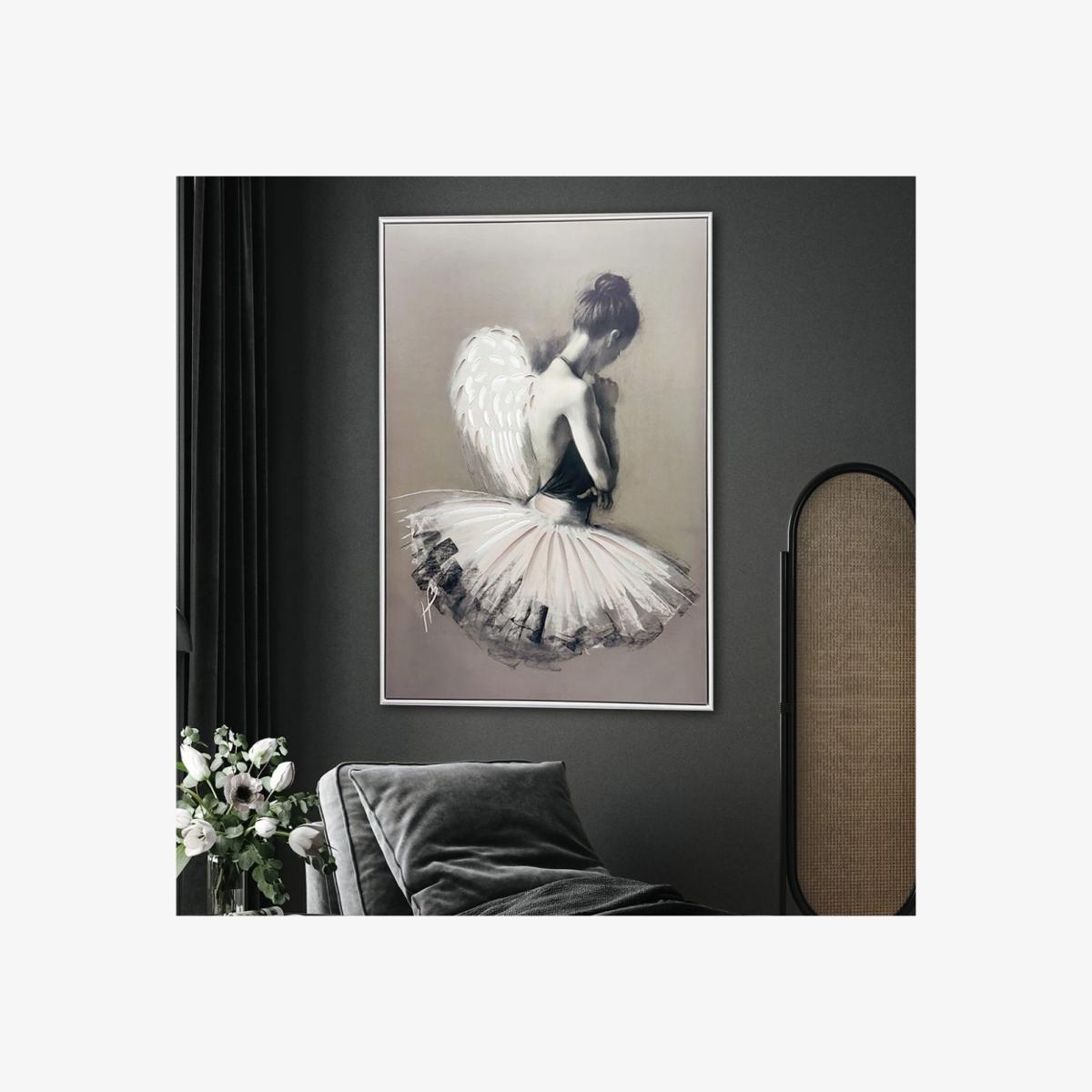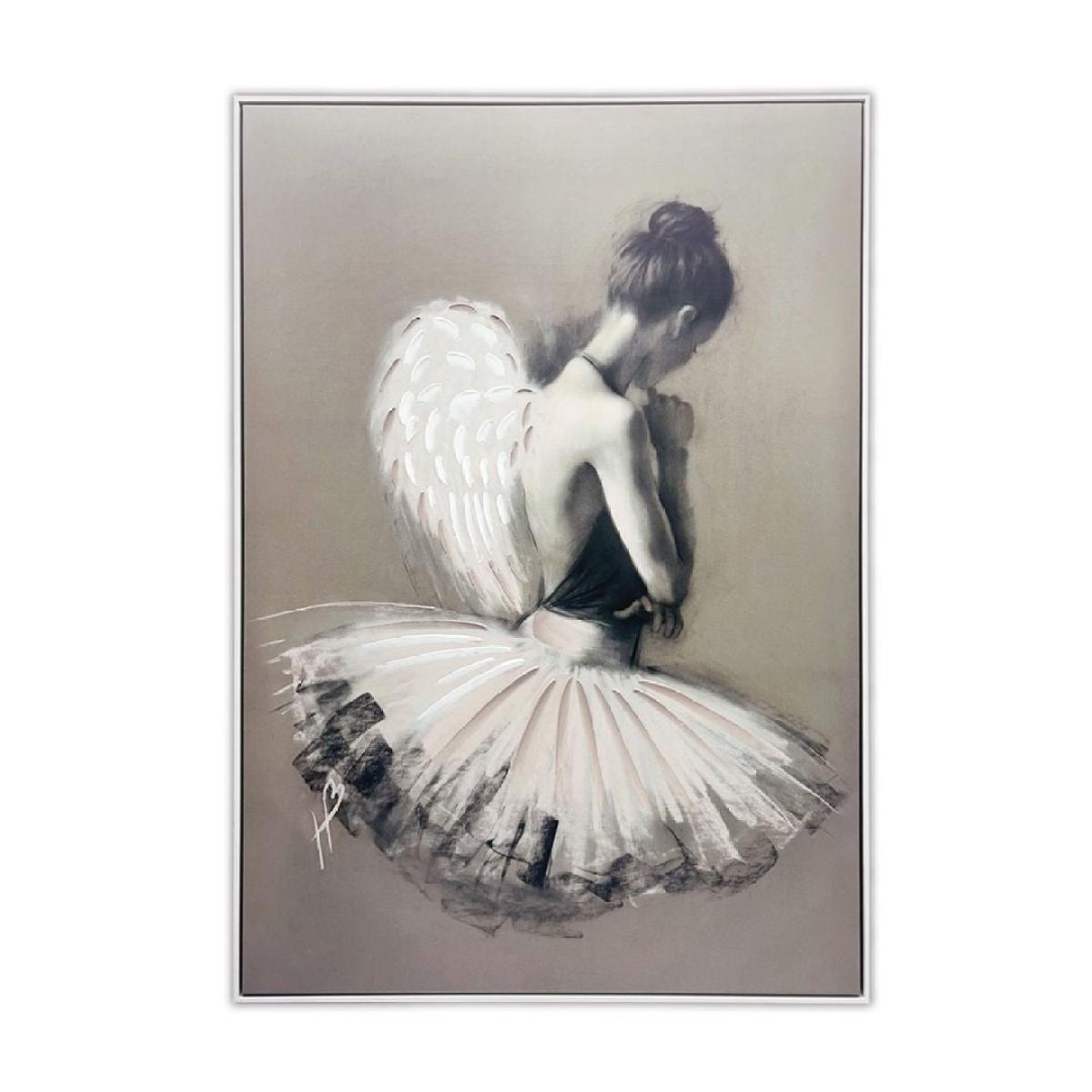 Digital print on canvas by Hazel Bowman, paired with a white frame and hand-painted embellishments. by Hazel Bowman is a graceful and emotive print on canvas, presented in a refined white frame. The artwork features a charcoal-rendered ballerina with delicate angel wings, her form captured against a soft taupe background that adds warmth and elegance. Hand-painted embellishments bring depth and texture to the piece, enhancing the ethereal quality of the wings. Combining classical technique with contemporary presentation, this canvas evokes both strength and serenity—perfect for adding a sense of calm beauty to a bedroom, dressing area or tranquil corner of the home.