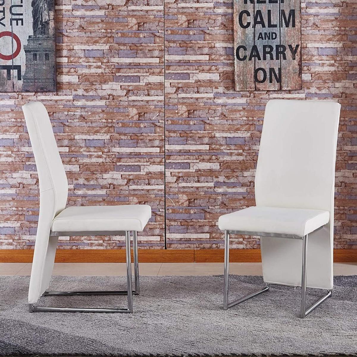 Set of 4 High-quality premium faux leather looks like expensive real leather but adds the benefits of synthetic material, easy to clean and maintain. The chairs backrest/seat cushions full filled with foam, when your back touches it, you will feel the comfort bounce and support Cube metal base to ensure Sturdy, Durable and Long-Lasting Use. Plastic feet on the bottom to prevent damage to the floor.