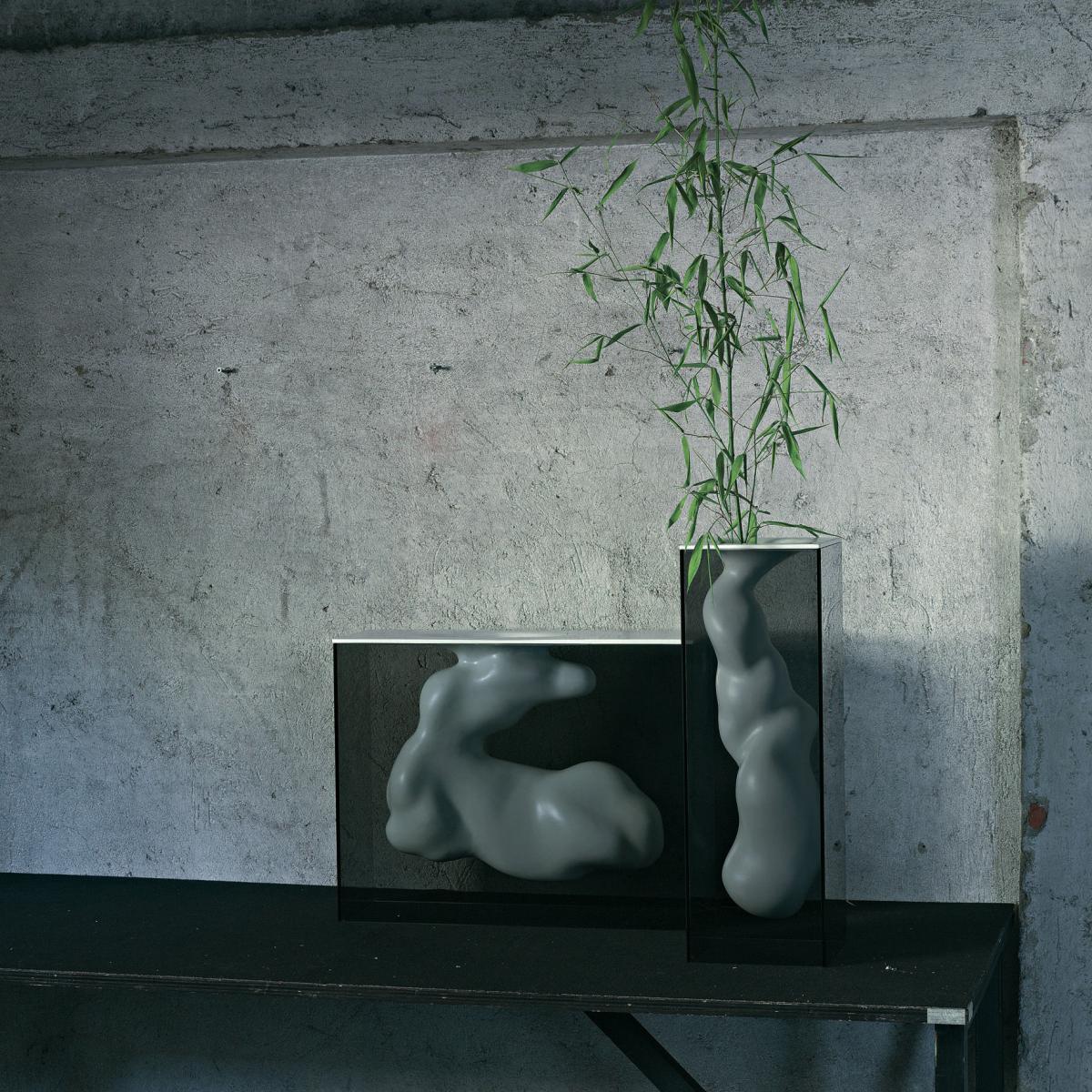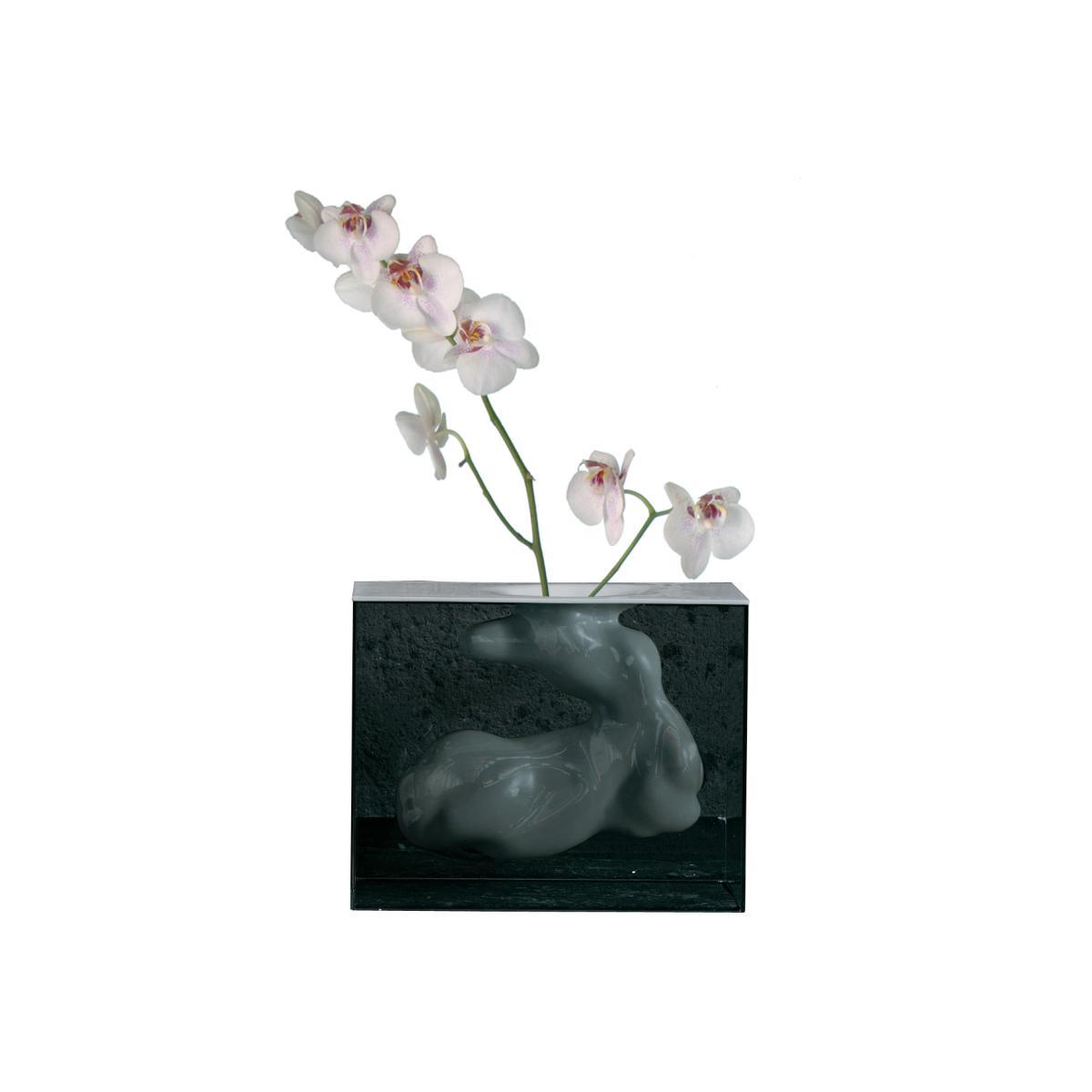 A series of vases composed of a parallelepiped shaped case, realized in smoked glass, glued 45°, and an organic shaped ceramic sculpture, supported and contained in its inside. The ceramic element, available in the finishes opaque white or platinum lacquered, is hollow and can contain water.