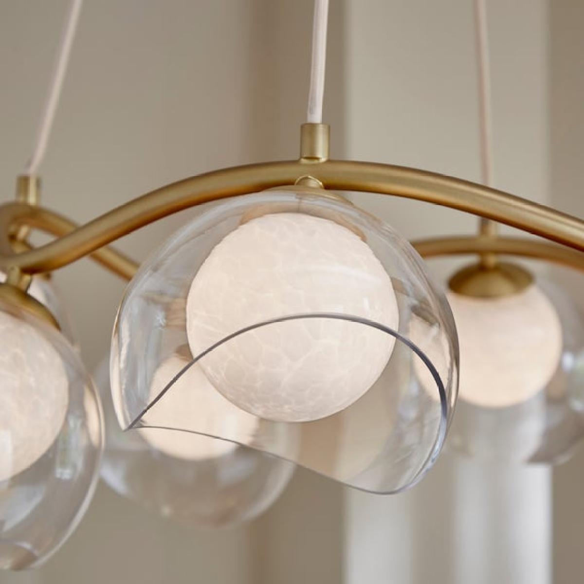 * Stunning, Eye-Catching Look & Design * Hoop Detailing * Made from Sturdy Materials * Matching Items Available The Angelina Adjustable Hoop Ceiling Light blends elegance with modern charm. Featuring white confetti glass framed by a soft clear glass cover and brass hoop detailing, it’s a refined centrepiece with matching items available for a cohesive look.