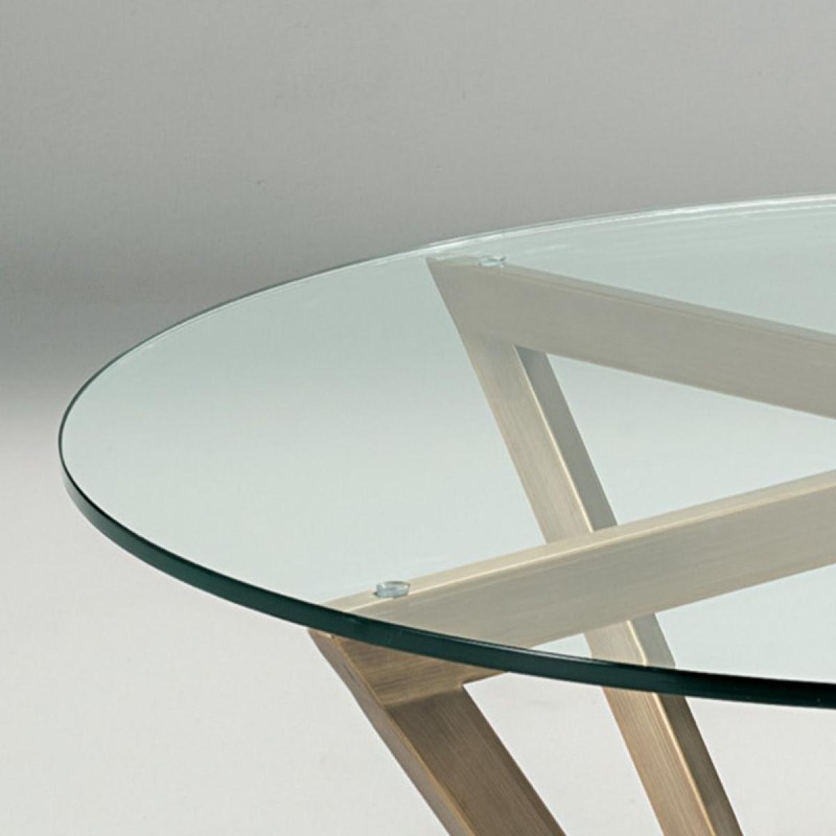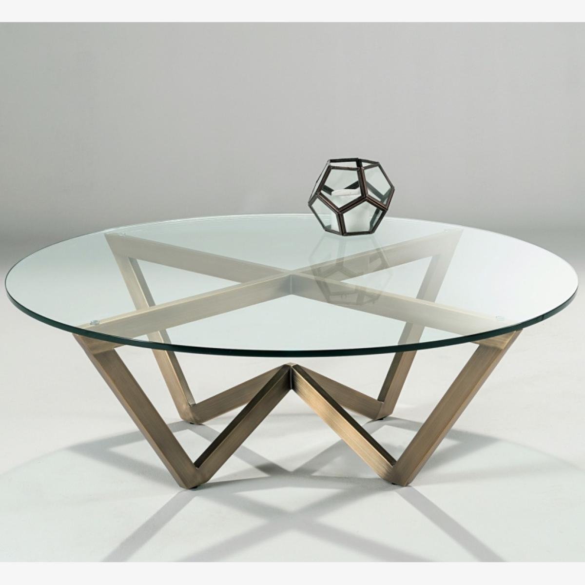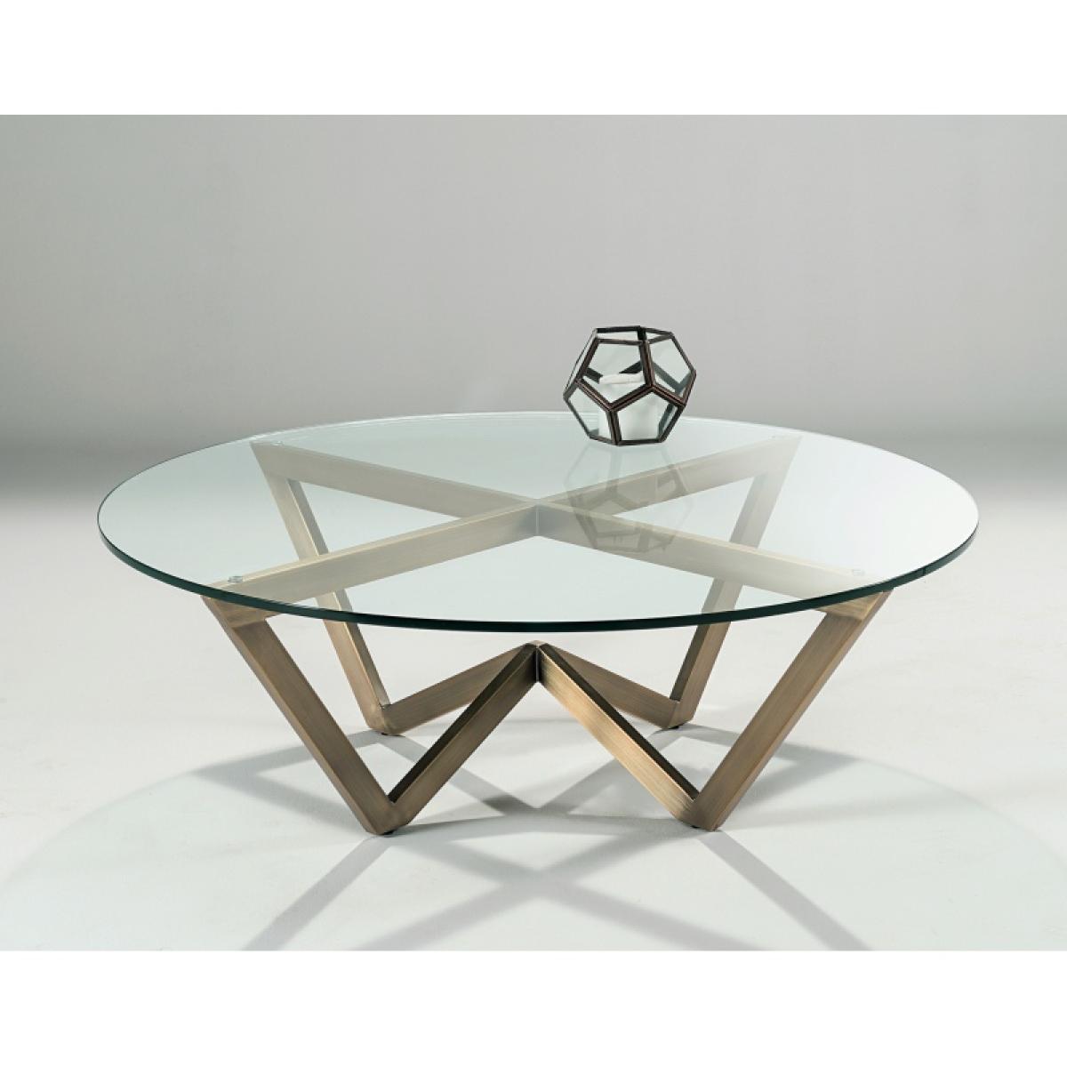 This modern and contemporary coffee table is architecturally inspired and guaranteed to make a stunning statement to your home. Architecturally inspired, stainless steel framework in brushed bronze finish, topped with 12mm clear tempered glass. Features: Top -  12mm Clear Tempered Glass Base - Brushed brass stainless steel Fully Assembled 5 Year Warranty Coffee Table Dimensions: Diameter: 105cm Height: 36cm Please note: All screens vary in colour reproduction and whilst every effort has been made to display the colour as accurately as possible it is for guidance only.