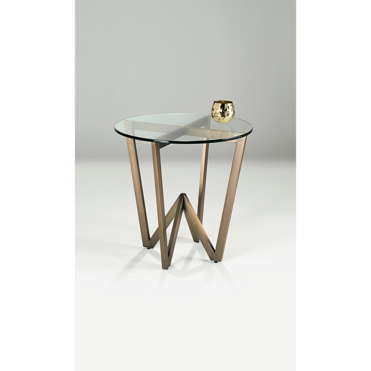 This modern and contemporary side table is architecturally inspired and guaranteed to make a stunning statement to your home.  Architecturally inspired, stainless steel framework in brushed bronze finish, topped with 12mm clear tempered glass. Features: Top -  12mm Clear Tempered Glass Base - Brushed brass stainless steel Fully Assembled 5 Year Warranty Side Table Dimensions: Diameter: 50cm Height: 55cm Please note: All screens vary in colour reproduction and whilst every effort has been made to display the colour as accurately as possible it is for guidance only.