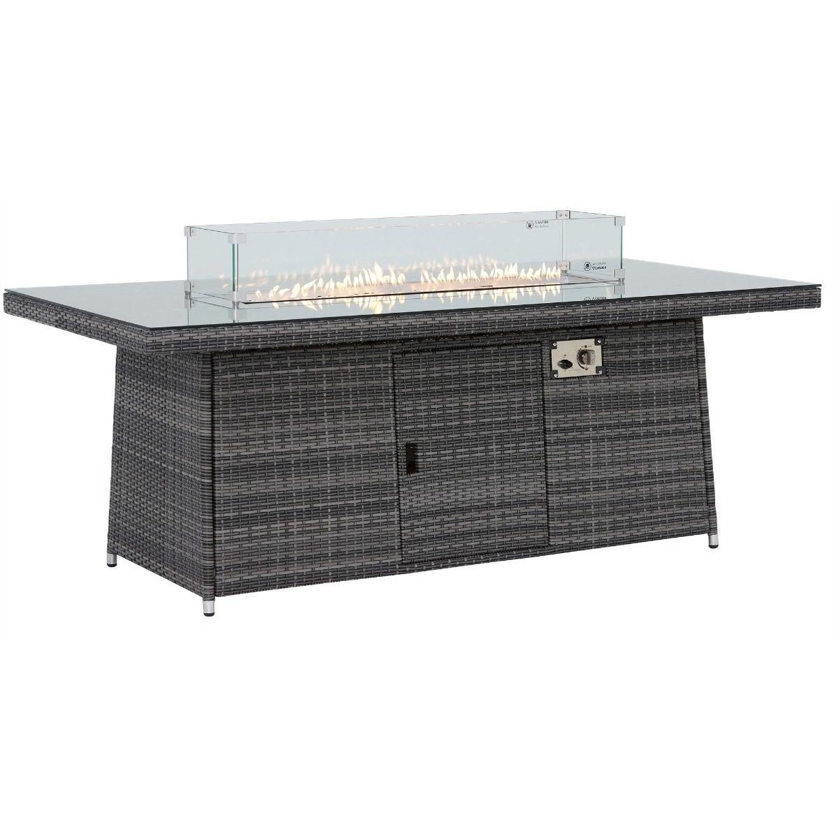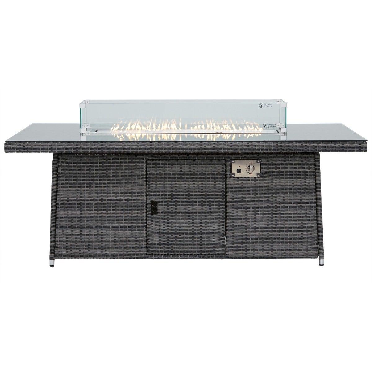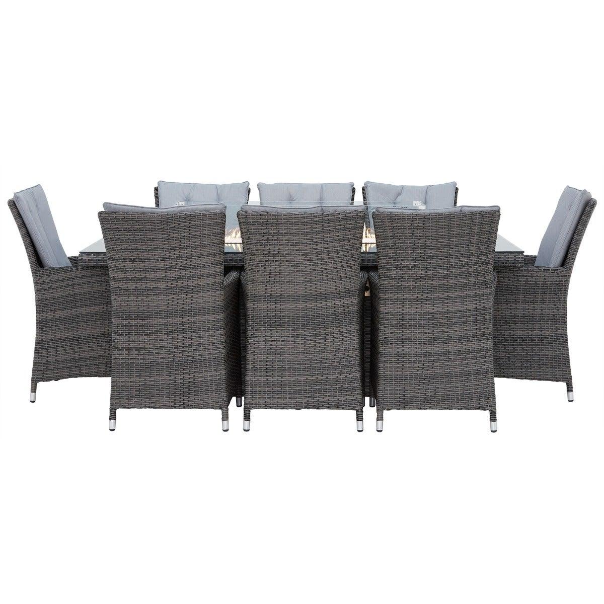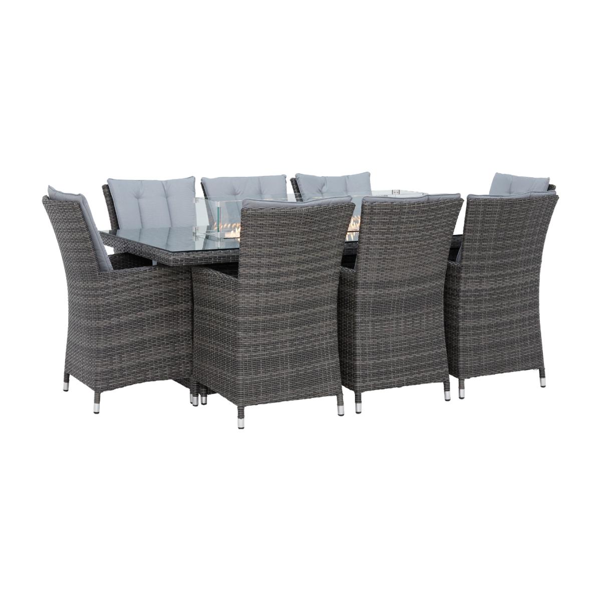 Design. For ultimate comfort and luxury, the stunning Anglesey. 8 Seater. Dining Set with Fire Pit, Grey is the one for you. Ideal for. Al. Fresco. Entertainment,. Its large table with 8 comfortable seats accommodate everyone. Complete with a fire pit, taking it to a whole new level of magnificence allows you to create a cozy, opulent atmosphere as the sun sets. You and your guests. Will not. Want the night to end.