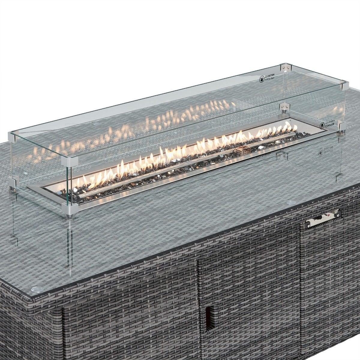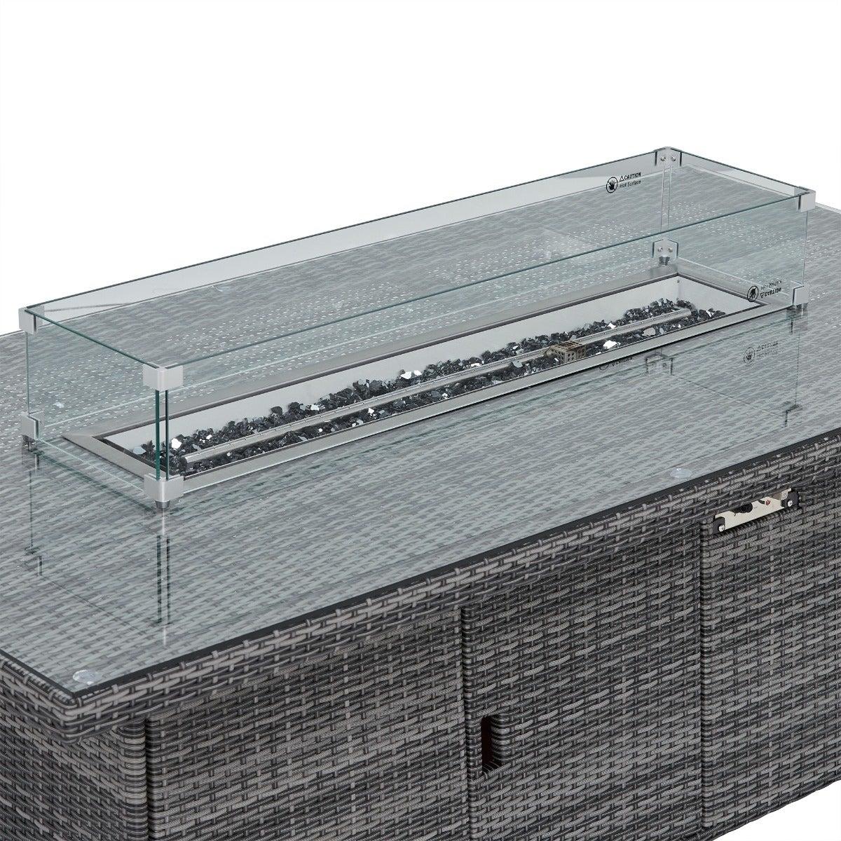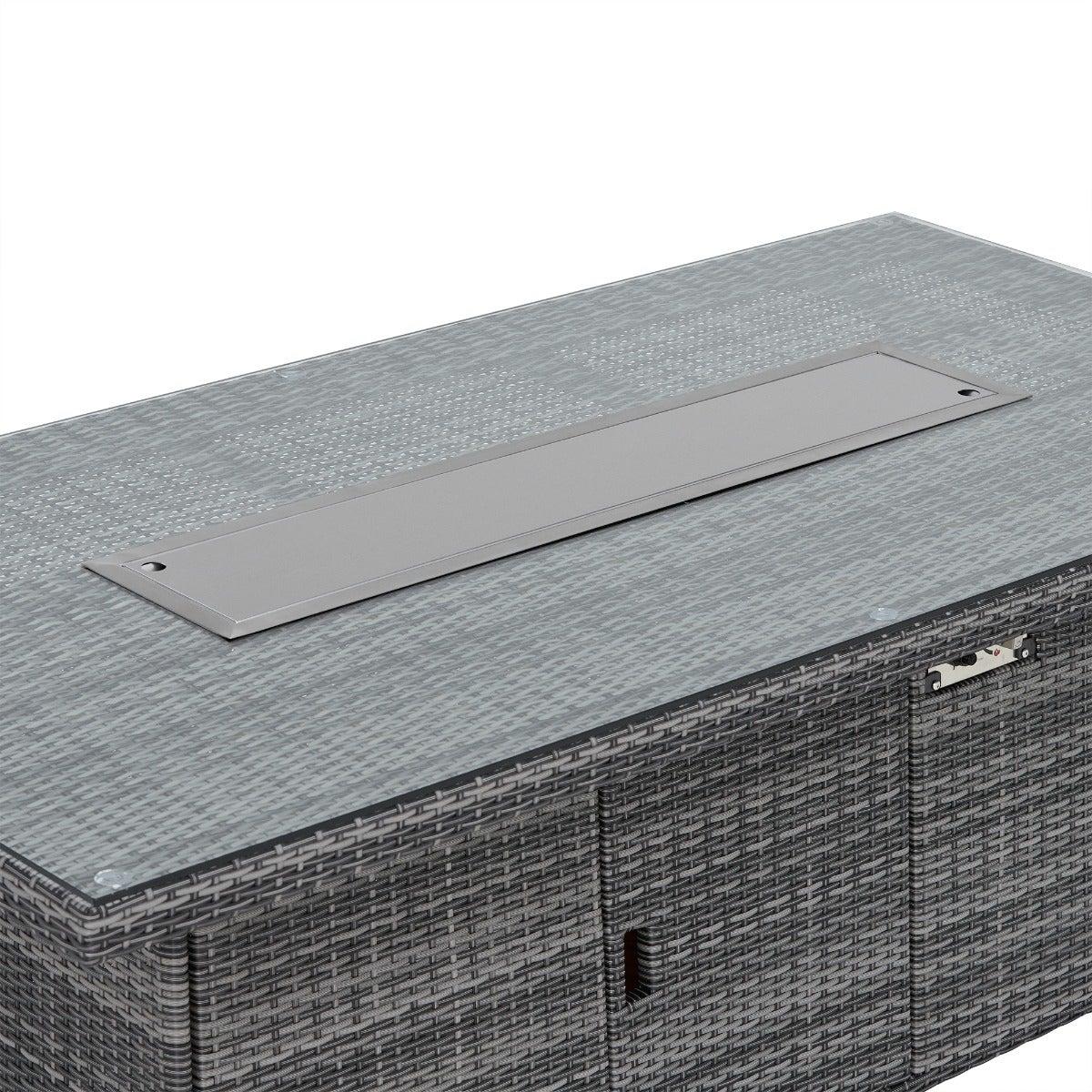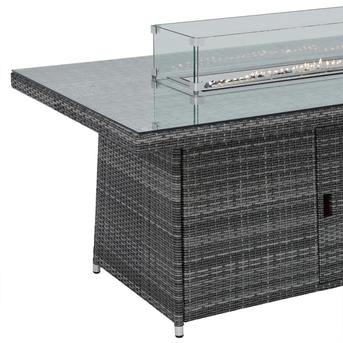 Design. For ultimate comfort and luxury, the stunning Anglesey. 8 Seater. Dining Set with Fire Pit, Grey is the one for you. Ideal for. Al. Fresco. Entertainment,. Its large table with 8 comfortable seats accommodate everyone. Complete with a fire pit, taking it to a whole new level of magnificence allows you to create a cozy, opulent atmosphere as the sun sets. You and your guests. Will not. Want the night to end.
