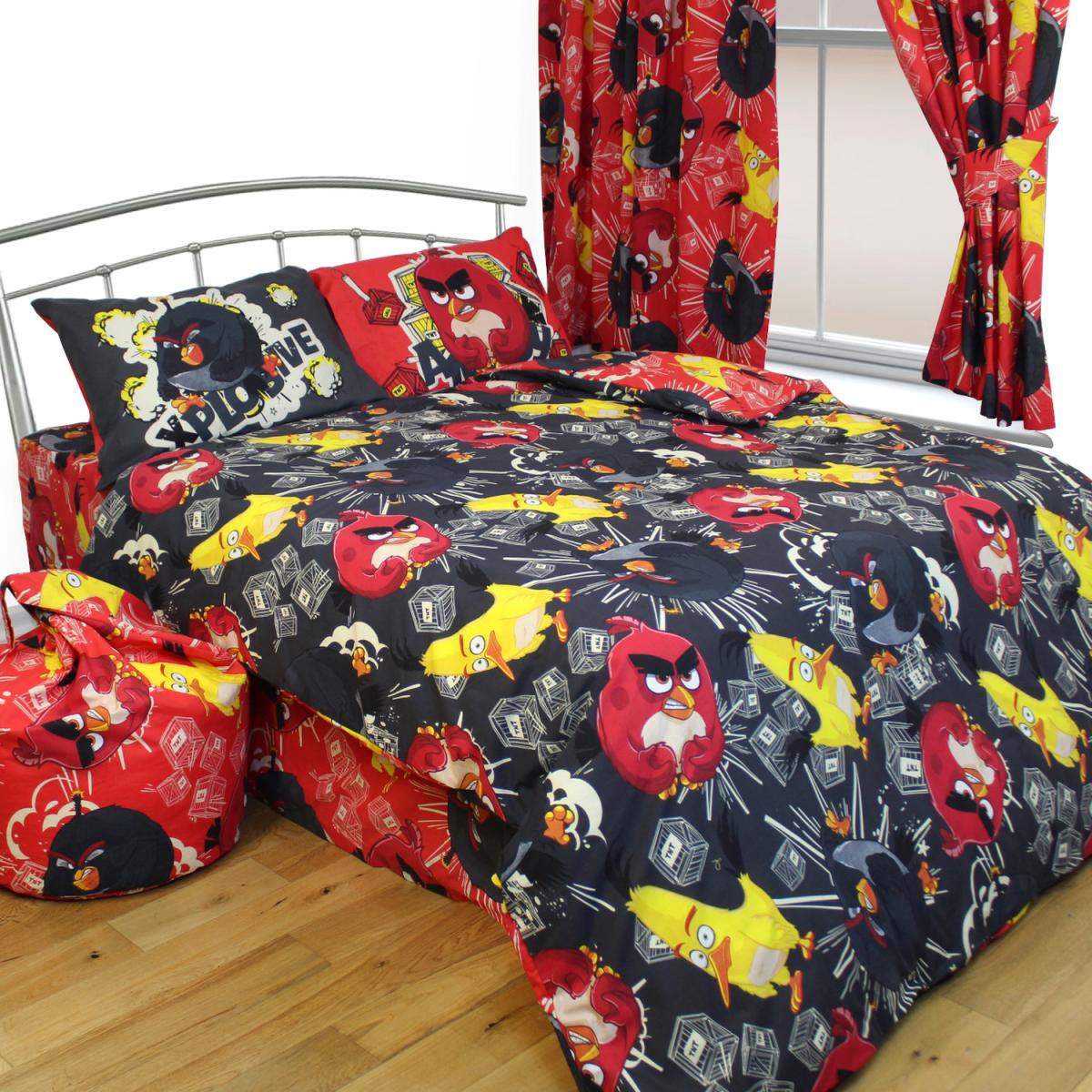 Bright and bold Angry Birds bedding range, featuring Red, Bomb and Chuck. Reversible design with a black ground on one side and a red ground on the other side. Matching accessories such as curtains, cushions and bean bags are available separately.