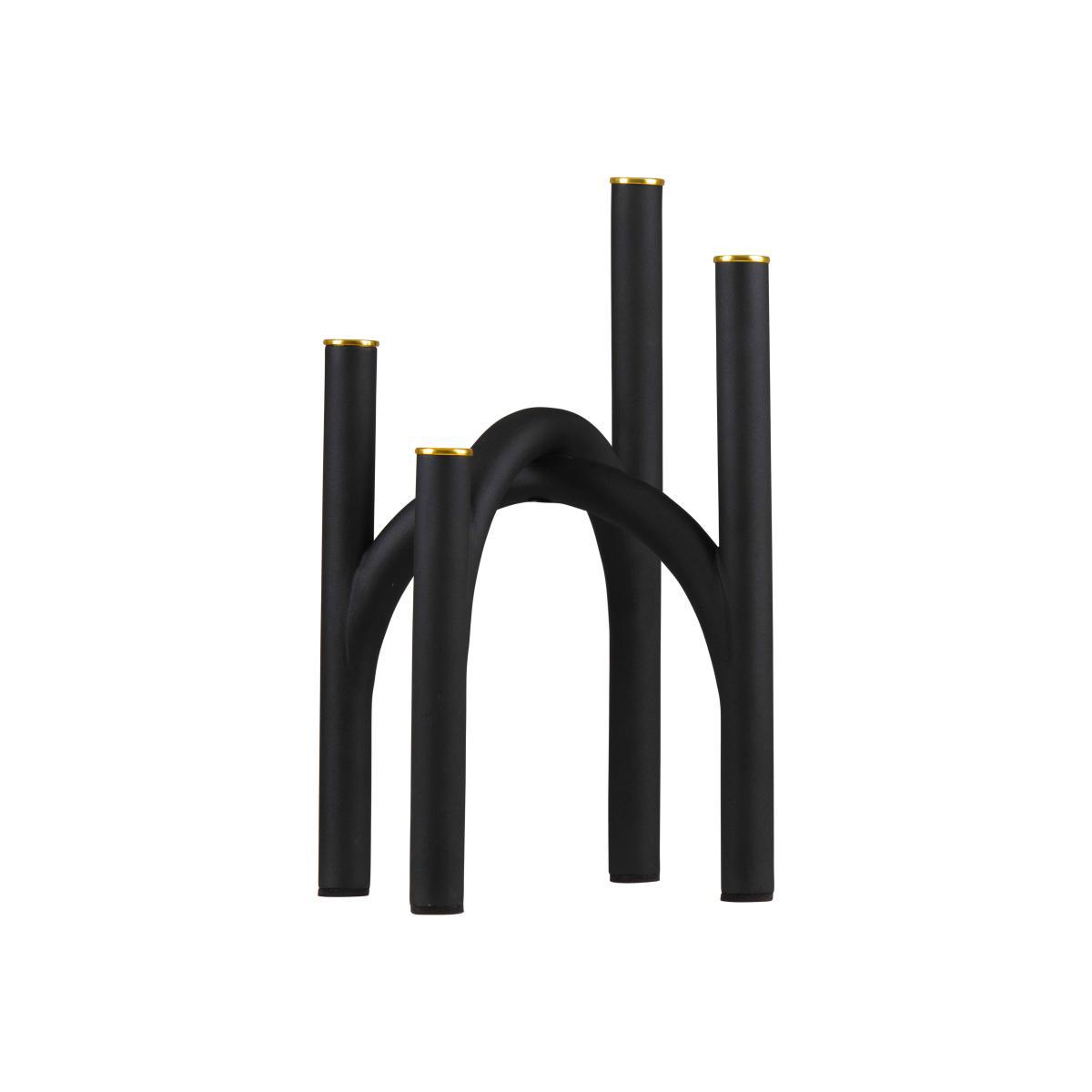An industrial chic look for this incredible metal candelabra. This is an ultra-modern revisit of baroque candelabras with multiple branches and an elongated stem. The tubular metal structure outlines intertwined shapes and lightweight loops in the space. Given its asymmetrical design, the candles will project wonderful, curious shadows at various levels. This sculptural candelabra boasts an elegant, matte black finish. Its extremities are enhanced with golden rings.