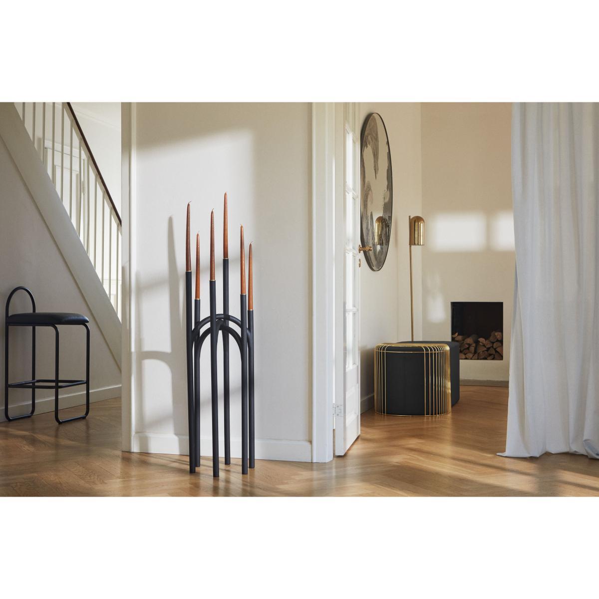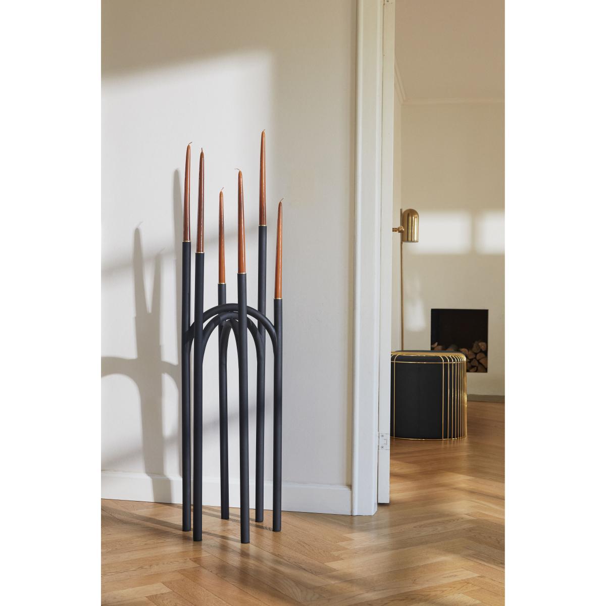 An industrial chic look for this incredible, metal floor candelabra. This is an ultra-modern revisit of baroque candelabras with multiple branches and an elongated stem. The tubular metal structure outlines intertwined shapes and lightweight loops in the space. Given its asymmetrical design, the candles will project wonderful, curious shadows at various levels. This sculptural candelabra boasts an elegant, matte black finish. Its extremities are enhanced with golden rings. This large floor candelabra (H 92 cm) has a silhouette that is both robust and svelte… It creates a unique, ultra-elegant ambiance.