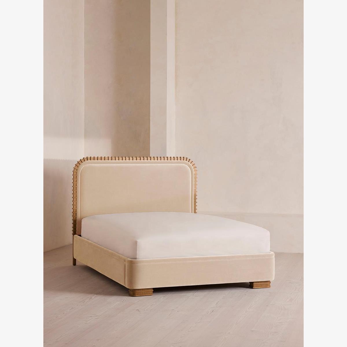 I’m a fan of this Angus king bed in porcelain velvet because its low-profile frame and soft curves slot straight into both contemporary and more traditional schemes. The neutral velvet upholstery adds a subtle luxe touch without overwhelming, so you can pair it with bold wallpaper or keep things pared back with crisp linens in muted tones. For styling, lean a couple of oversized cushions against the headboard to show off its stitched detail, then layer a tactile throw at the foot in a contrasting texture - think boucle or knitted wool. Just remember to brush the velvet regularly to keep it looking fresh.